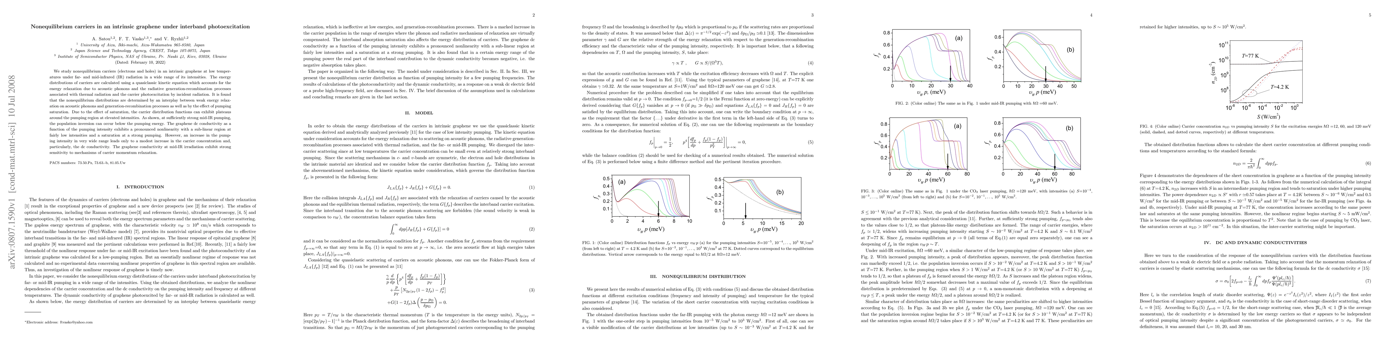 This paper investigates the behavior of nonequilibrium carriers in intrinsic graphene under interband photoexcitation by infrared radiation, revealing that the carrier distribution is influenced by energy relaxation and generation-recombination processes. The study shows that high-intensity mid-IR pumping can lead to population inversion and a nonlinear, saturating conductivity response, with significant sensitivity to carrier momentum relaxation mechanisms.