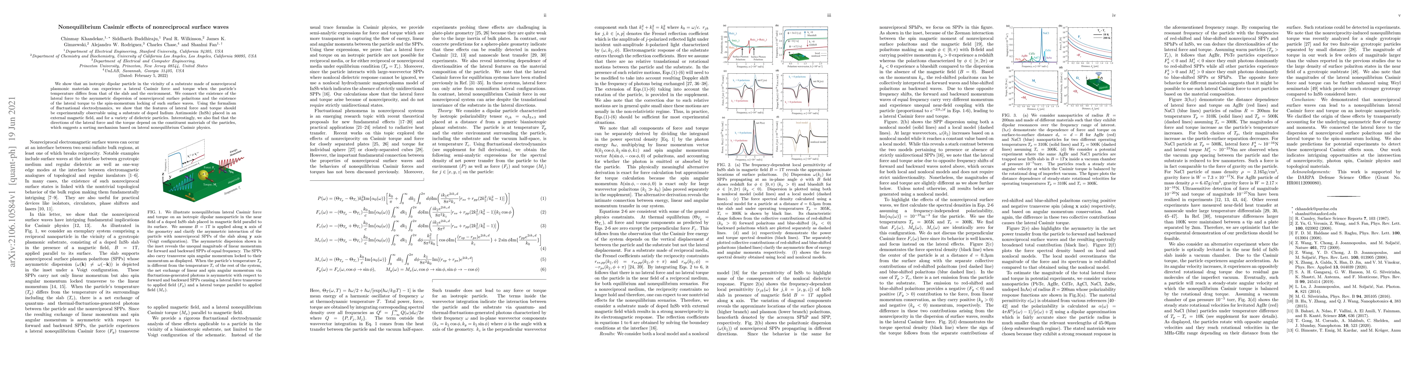We show that an isotropic dipolar particle in the vicinity of a substrate made of nonreciprocal plasmonic materials can experience a lateral Casimir force and torque when the particle's temperature differs from that of the slab and the environment. We connect the existence of the lateral force to the asymmetric dispersion of nonreciprocal surface polaritons and the existence of the lateral torque to the spin-momentum locking of such surface waves. Using the formalism of fluctuational electrodynamics, we show that the features of lateral force and torque should be experimentally observable using a substrate of doped Indium Antimonide (InSb) placed in an external magnetic field, and for a variety of dielectric particles. Interestingly, we also find that the directions of the lateral force and the torque depend on the constituent materials of the particles, which suggests a sorting mechanism based on lateral nonequilibrium Casimir physics.