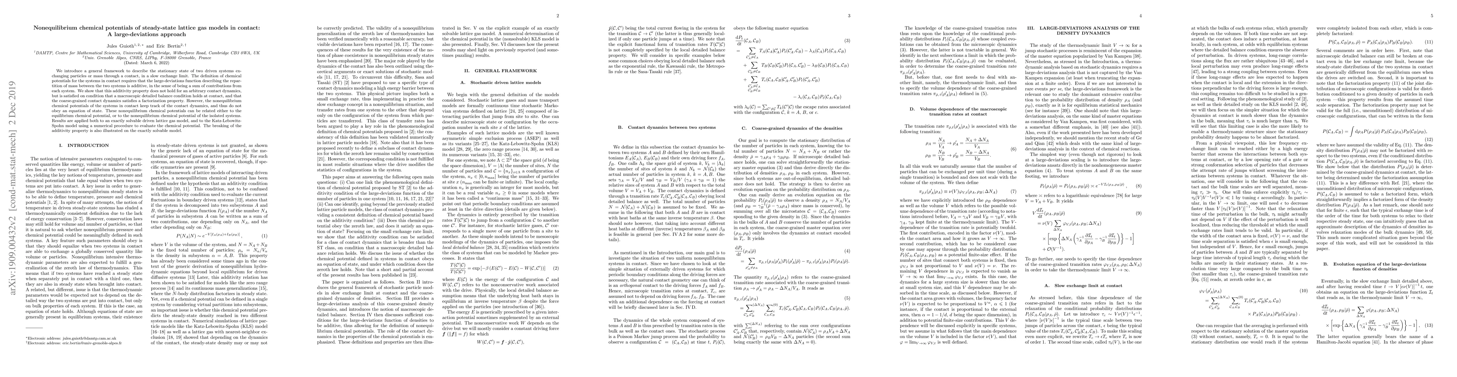We introduce a general framework to describe the stationary state of two driven systems exchanging particles or mass through a contact, in a slow exchange limit. The definition of chemical potentials for the systems in contact requires that the large-deviations function describing the repartition of mass between the two systems is additive, in the sense of being a sum of contributions from each system. We show that this additivity property is satisfied on condition that a macroscopic detailed balance condition holds at contact, and that the coarse-grained contact dynamics satisfies a factorization property. However, the nonequilibrium chemical potentials of the systems in contact keep track of the contact dynamics, and thus do not obey an equation of state. These nonequilibrium chemical potentials can be related either to the equilibrium chemical potential, or to the nonequilibrium chemical potential of the isolated systems. Results are applied both to an exactly solvable driven lattice gas model, and to the Katz-Lebowitz-Spohn model using a numerical procedure to evaluate the chemical potential.