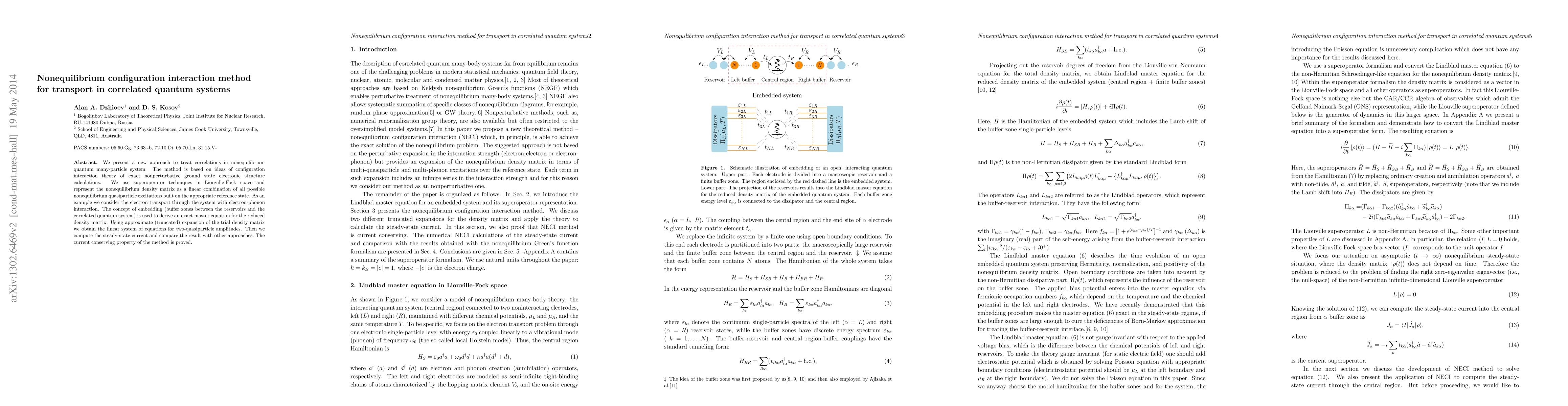 This paper introduces a novel nonequilibrium configuration interaction method for studying transport in correlated quantum systems using superoperator techniques. The method derives an exact master equation for the reduced density matrix and computes steady-state current, demonstrating current conservation and comparing results with other approaches.