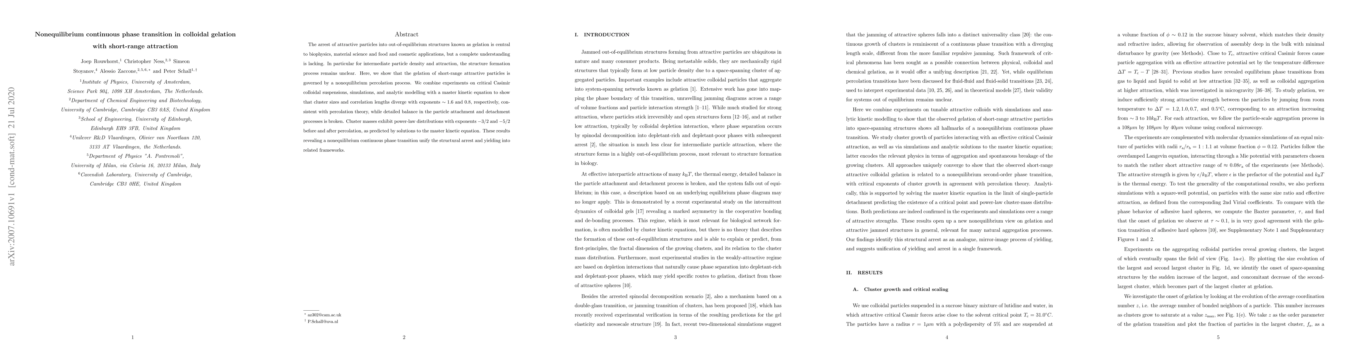 This study elucidates the nonequilibrium gelation process of short-range attractive colloidal particles through experiments, simulations, and modeling, demonstrating a continuous phase transition governed by percolation theory, with critical exponents indicating a breakdown of detailed balance.