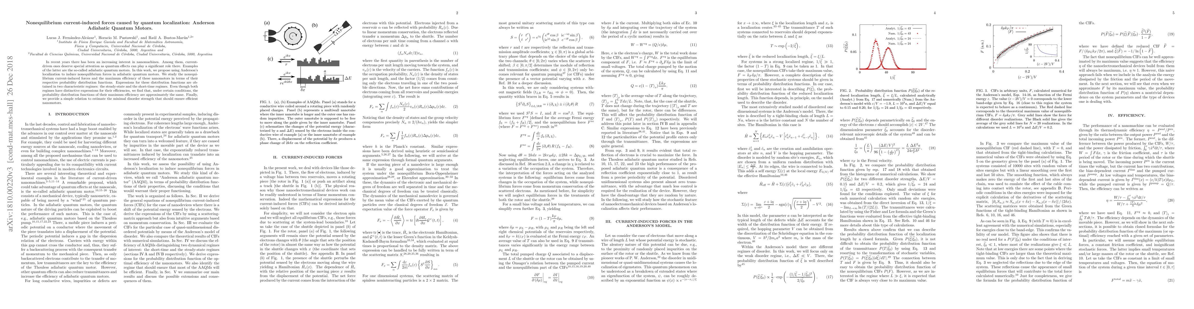In recent years there has been an increasing interest in nanomachines. Among them, current-driven ones deserve special attention as quantum effects can play a significant role there. Examples of the latter are the so-called adiabatic quantum motors. In this work, we propose using Anderson's localization to induce nonequilibrium forces in adiabatic quantum motors. We study the nonequilibrium current-induced forces and the maximum efficiency of these nanomotors in terms of their respective probability distribution functions. Expressions for these distribution functions are obtained in two characteristic regimes: the steady-state and the short-time regimes. Even though both regimes have distinctive expressions for their efficiencies, we find that, under certain conditions, the probability distribution functions of their maximum efficiency are approximately the same. Finally, we provide a simple relation to estimate the minimal disorder strength that should ensure efficient nanomotors.