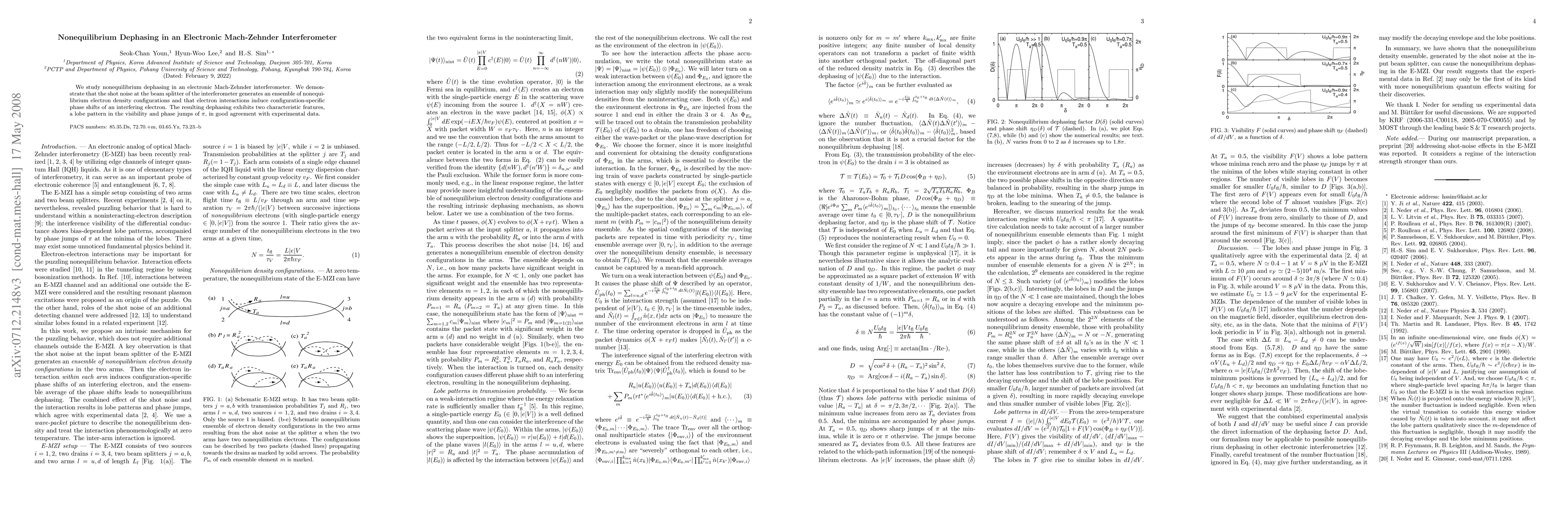 This research investigates nonequilibrium dephasing in an electronic Mach-Zehnder interferometer, showing that shot noise generates unique electron density configurations and electron interactions cause configuration-specific phase shifts, resulting in lobe patterns in visibility and $\pi$ phase jumps, aligning with experimental observations.