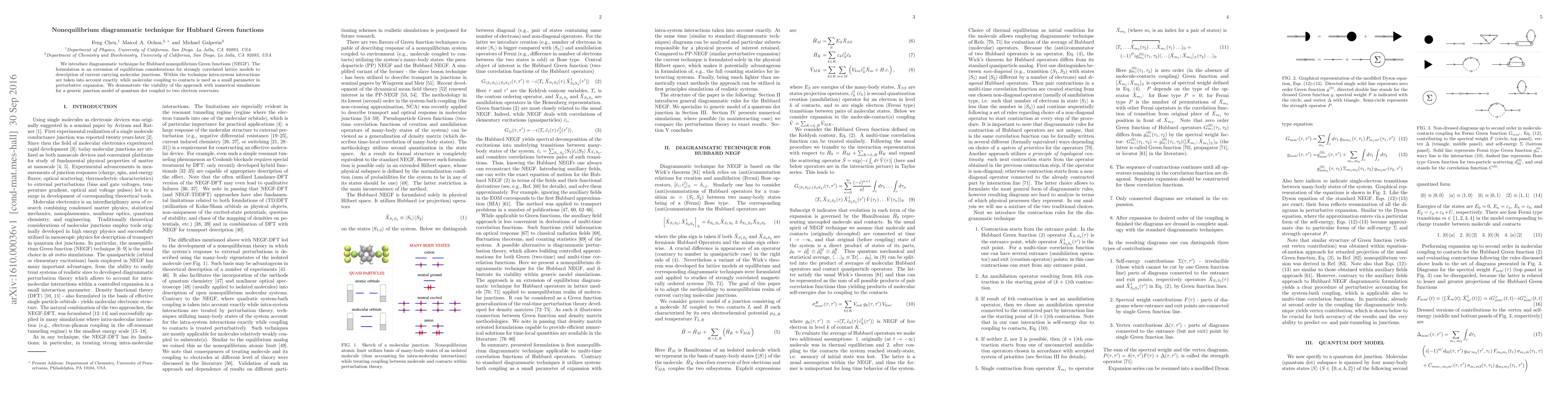 We introduce diagrammatic technique for Hubbard nonequilibrium Green functions (NEGF). The formulation is an extension of equilibrium considerations for strongly correlated lattice models to description of current carrying molecular junctions. Within the technique intra-system interactions are taken into account exactly, while molecular coupling to contacts is used as a small parameter in perturbative expansion. We demonstrate the viability of the approach with numerical simulations for a generic junction model of quantum dot coupled to two electron reservoirs.