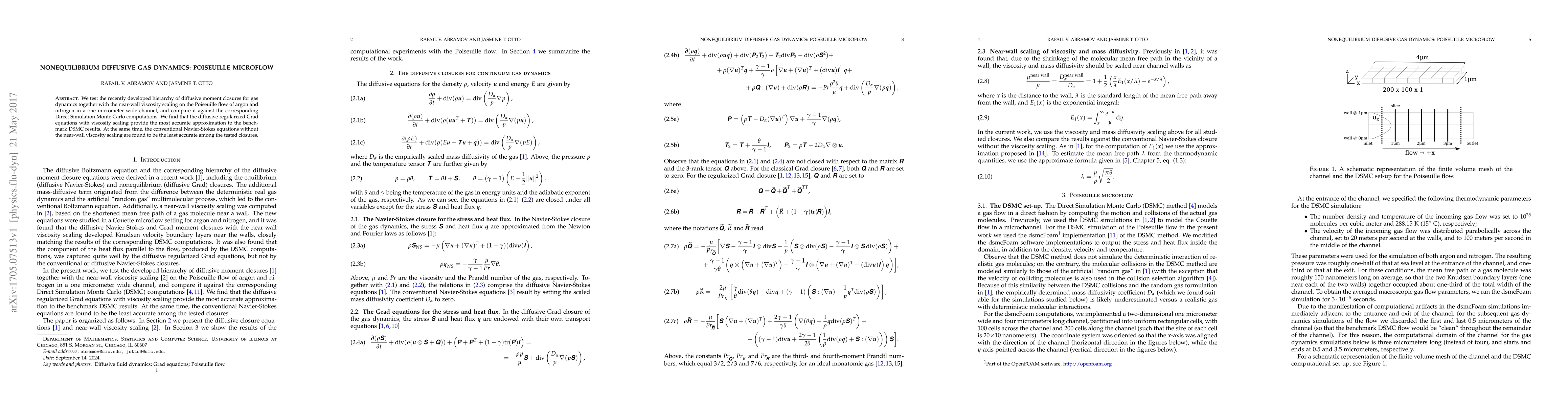 The paper evaluates diffusive moment closures for gas dynamics using Poiseuille flow of argon and nitrogen in a micrometer-wide channel. It finds that regularized Grad equations with near-wall viscosity scaling accurately approximate DSMC results, while conventional Navier-Stokes equations without scaling are the least accurate.