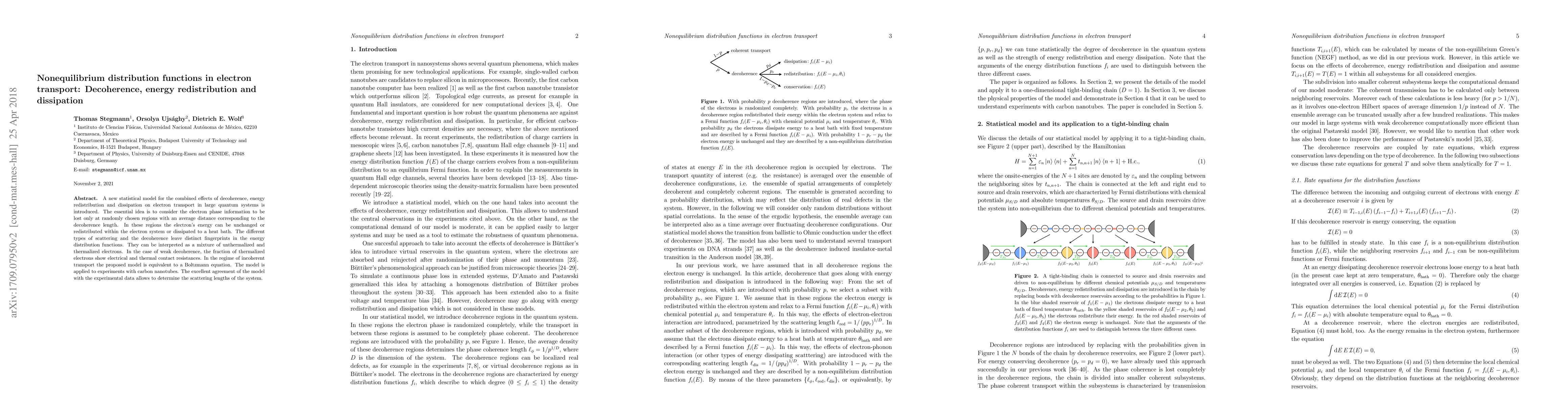 A new statistical model for the combined effects of decoherence, energy redistribution and dissipation on electron transport in large quantum systems is introduced. The essential idea is to consider the electron phase information to be lost only at randomly chosen regions with an average distance corresponding to the decoherence length. In these regions the electron's energy can be unchanged or redistributed within the electron system or dissipated to a heat bath. The different types of scattering and the decoherence leave distinct fingerprints in the energy distribution functions. They can be interpreted as a mixture of unthermalized and thermalized electrons. In the case of weak decoherence, the fraction of thermalized electrons show electrical and thermal contact resistances. In the regime of incoherent transport the proposed model is equivalent to a Boltzmann equation. The model is applied to experiments with carbon nanotubes. The excellent agreement of the model with the experimental data allows to determine the scattering lengths of the system.