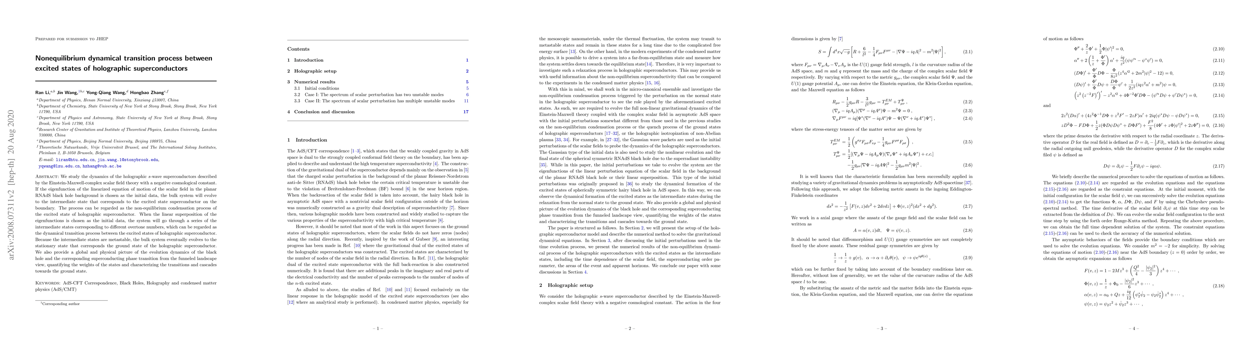 We study the dynamics of the holographic $s$-wave superconductors described by the Einstein-Maxwell-complex scalar field theory with a negative cosmological constant. If the eigenfunction of the linearized equation of motion of the scalar field in the planar RNAdS black hole background is chosen as the initial data, the bulk system will evolve to the intermediate state that corresponds to the excited state superconductor on the boundary. The process can be regarded as the non-equilibrium condensation process of the excited state of holographic superconductor. When the linear superposition of the eigenfunctions is chosen as the initial data, the system will go through a series of the intermediate states corresponding to different overtone numbers, which can be regarded as the dynamical transition process between the excited states of holographic superconductor. Because the intermediate states are metastable, the bulk system eventually evolves to the stationary state that corresponds the ground state of the holographic superconductor. We also provide a global and physical picture of the evolution dynamics of the black hole and the corresponding superconducting phase transition from the funneled landscape view, quantifying the weights of the states and characterizing the transitions and cascades towards the ground state.
