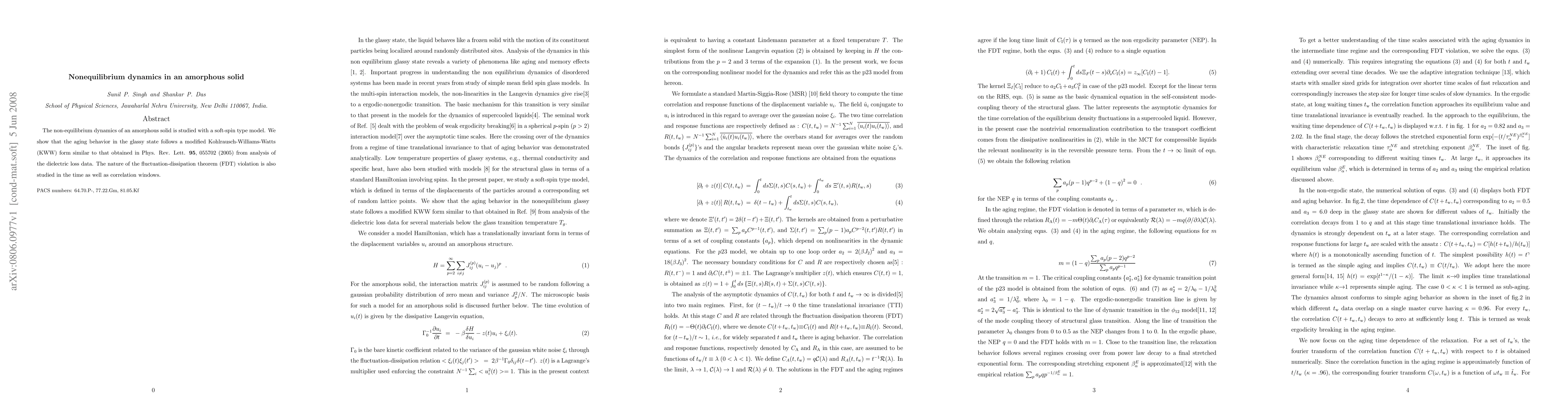 The non-equilibrium dynamics of an amorphous solid is studied with a soft-spin type model. We show that the aging behavior in the glassy state follows a modified Kohlrausch-Williams-Watts (KWW) form similar to that obtained in Phys. Rev. Lett. {\bf 95}, 055702 (2005) from analysis of the dielectric loss data. The nature of the fluctuation-dissipation theorem (FDT) violation is also studied in the time as well as correlation windows.