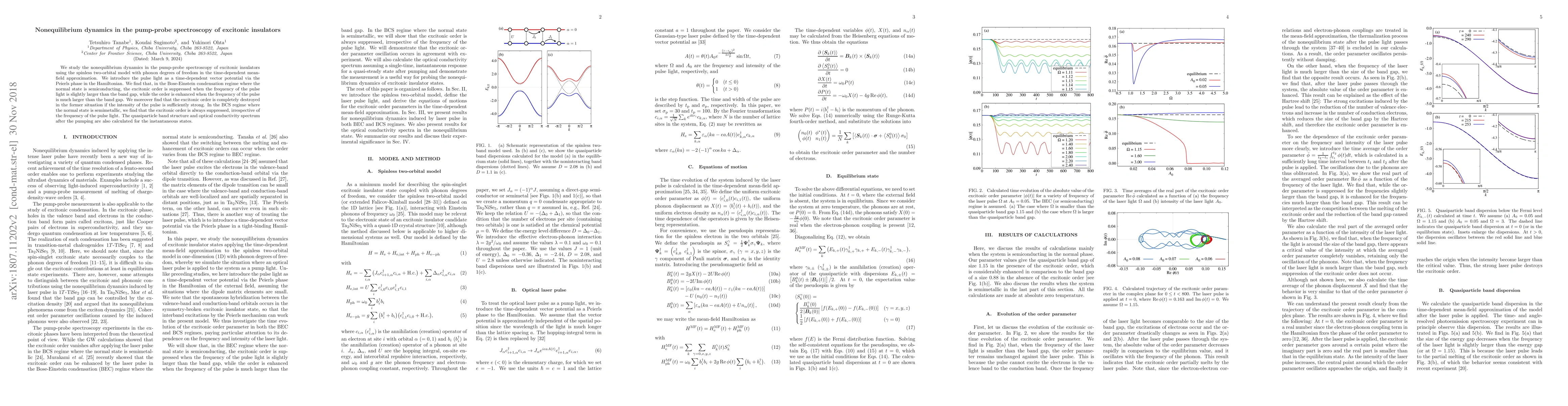 We study the nonequilibrium dynamics in the pump-probe spectroscopy of excitonic insulators using the spinless two-orbital model with phonon degrees of freedom in the time-dependent mean-field approximation. We introduce the pulse light as a time-dependent vector potential via the Peierls phase in the Hamiltonian. We find that, in the Bose-Einstein condensation regime where the normal state is semiconducting, the excitonic order is suppressed when the frequency of the pulse light is slightly larger than the band gap, while the order is enhanced when the frequency of the pulse is much larger than the band gap. We moreover find that the excitonic order is completely destroyed in the former situation if the intensity of the pulse is sufficiently strong. In the BCS regime where the normal state is semimetallic, we find that the excitonic order is always suppressed, irrespective of the frequency of the pulse light. The quasiparticle band structure and optical conductivity spectrum after the pumping are also calculated for the instantaneous states.