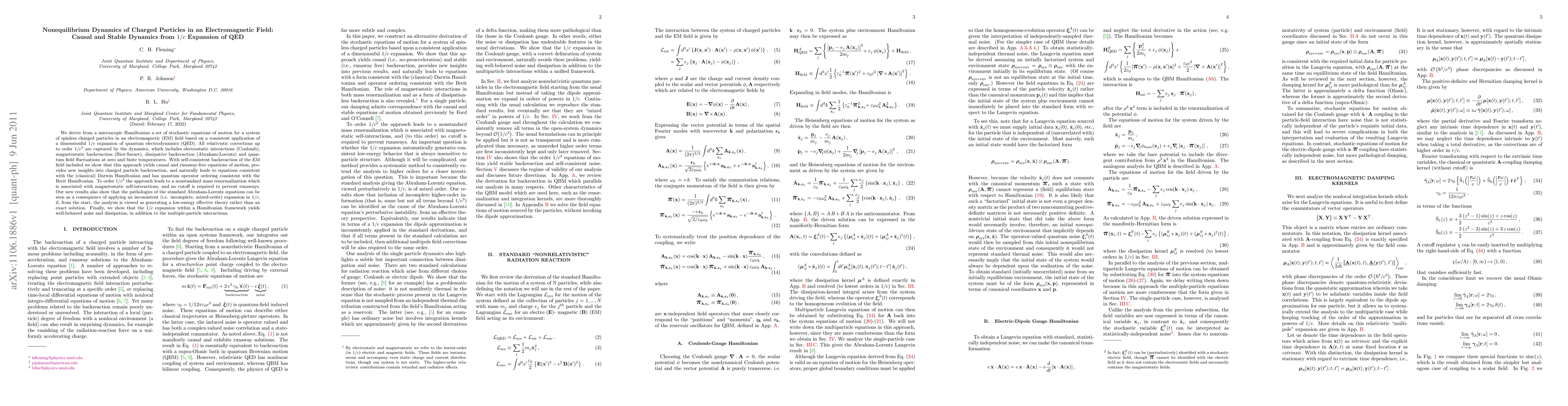 We derive from a microscopic Hamiltonian a set of stochastic equations of motion for a system of spinless charged particles in an electromagnetic (EM) field based on a consistent application of a dimensionful 1/c expansion of quantum electrodynamics (QED). All relativistic corrections up to order 1/c^3 are captured by the dynamics, which includes electrostatic interactions (Coulomb), magnetostatic backreaction (Biot-Savart), dissipative backreaction (Abraham-Lorentz) and quantum field fluctuations at zero and finite temperatures. With self-consistent backreaction of the EM field included we show that this approach yields causal and runaway-free equations of motion, provides new insights into charged particle backreaction, and naturally leads to equations consistent with the (classical) Darwin Hamiltonian and has quantum operator ordering consistent with the Breit Hamiltonian. To order 1/c^3 the approach leads to a nonstandard mass renormalization which is associated with magnetostatic self-interactions, and no cutoff is required to prevent runaways. Our new results also show that the pathologies of the standard Abraham-Lorentz equations can be seen as a consequence of applying an inconsistent (i.e. incomplete, mixed-order) expansion in 1/c, if, from the start, the analysis is viewed as generating a low-energy effective theory rather than an exact solution. Finally, we show that the 1/c expansion within a Hamiltonian framework yields well-behaved noise and dissipation, in addition to the multiple-particle interactions.
