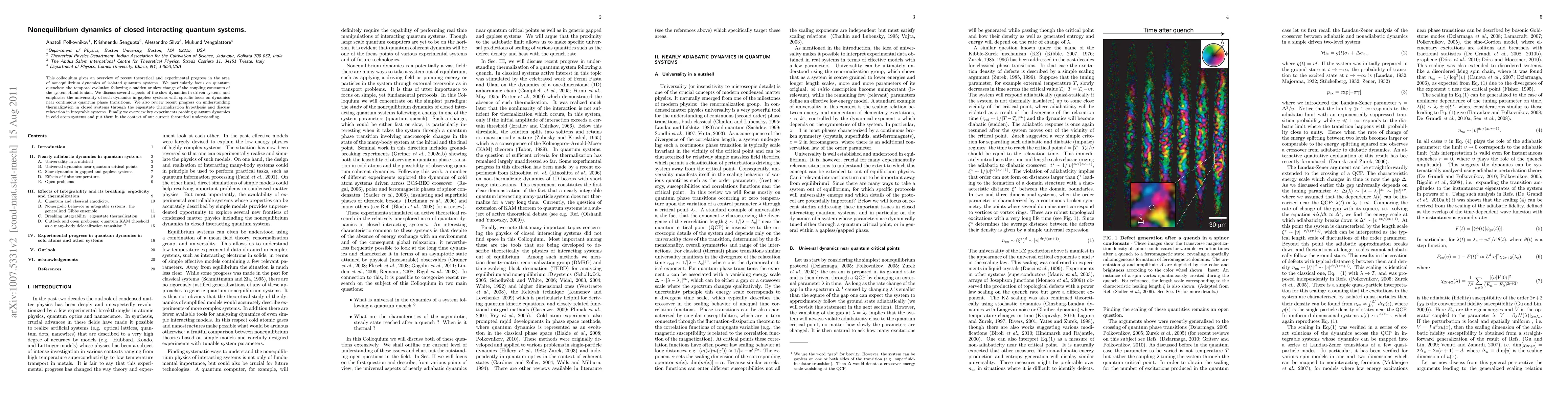 This paper reviews recent advances in nonequilibrium dynamics of isolated quantum systems, focusing on quantum quenches and the slow dynamics near continuous quantum phase transitions, while also discussing thermalization and relaxation in integrable systems, and linking experimental findings in cold atom systems with theoretical models.