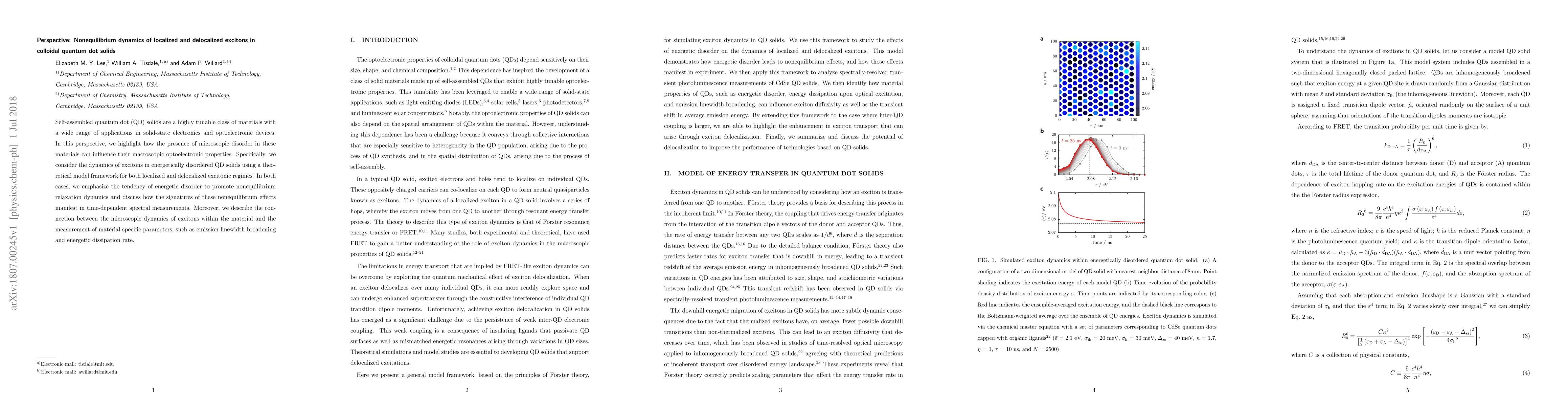 This paper explores the nonequilibrium dynamics of excitons in colloidal quantum dot solids, focusing on how microscopic disorder influences macroscopic optoelectronic properties. It uses theoretical models to analyze both localized and delocalized excitonic regimes, highlighting the role of energetic disorder in promoting nonequilibrium relaxation and its observable effects in spectral measurements.