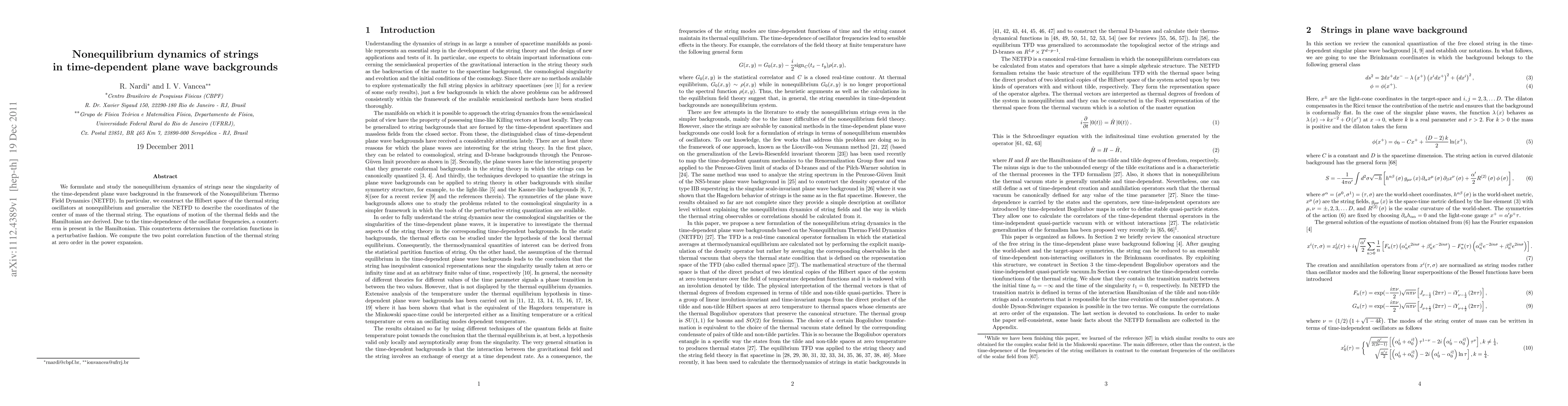 This paper investigates the nonequilibrium dynamics of strings in time-dependent plane wave backgrounds using the Nonequilibrium Thermo Field Dynamics framework. It introduces a counterterm to the Hamiltonian that determines correlation functions and computes the two-point correlation function at zero order in the power expansion.