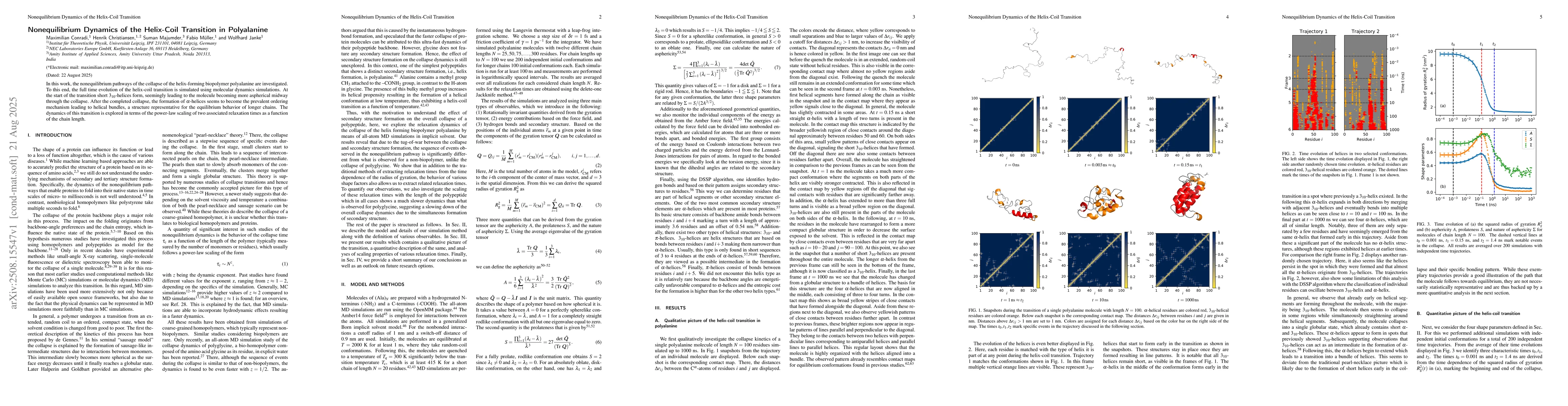 In this work, the nonequilibrium pathways of the collapse of the helix-forming biopolymer polyalanine are investigated. To this end, the full time evolution of the helix-coil transition is simulated using molecular dynamics simulations. At the start of the transition short $3_{10}$-helices form, seemingly leading to the molecule becoming more aspherical midway through the collapse. After the completed collapse, the formation of $\alpha$-helices seems to become the prevalent ordering mechanism leading to helical bundles, a structure representative for the equilibrium behavior of longer chains. The dynamics of this transition is explored in terms of the power-law scaling of two associated relaxation times as a function of the chain length.