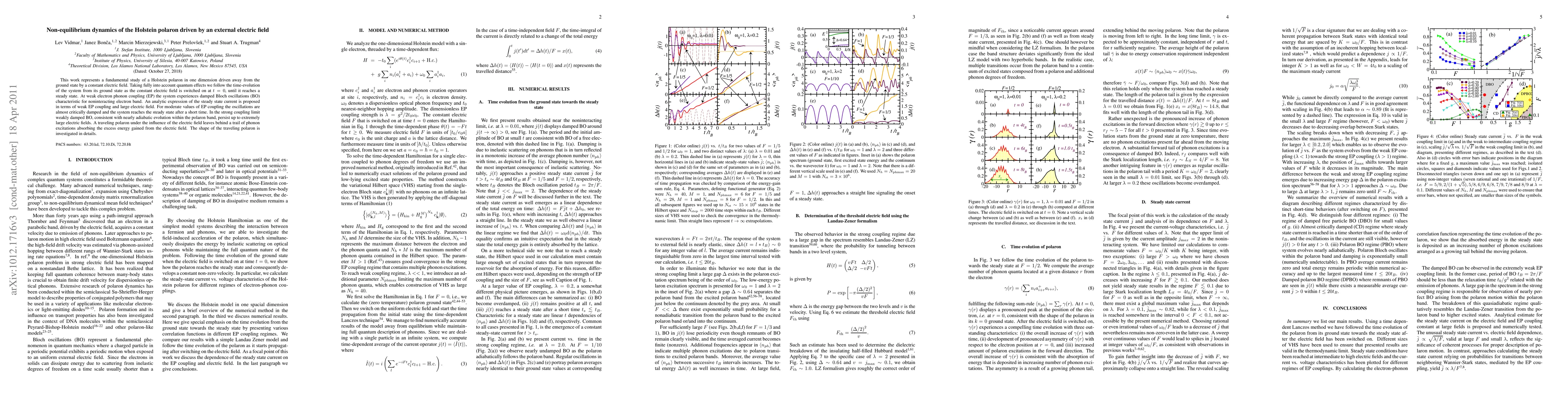 This work represents a fundamental study of a Holstein polaron in one dimension driven away from the ground state by a constant electric field. Taking fully into account quantum effects we follow the time-evolution of the system from its ground state as the constant electric field is switched on at t = 0, until it reaches a steady state. At weak electron phonon coupling (EP) the system experiences damped Bloch oscillations (BO) characteristic for noninteracting electron band. An analytic expression of the steady state current is proposed in terms of weak EP coupling and large electric field. For moderate values of EP coupling the oscillations are almost critically damped and the system reaches the steady state after a short time. In the strong coupling limit weakly damped BO, consistent with nearly adiabatic evolution within the polaron band, persist up to extremely large electric fields. A traveling polaron under the influence of the electric field leaves behind a trail of phonon excitations absorbing the excess energy gained from the electric field. The shape of the traveling polaron is investigated in details.