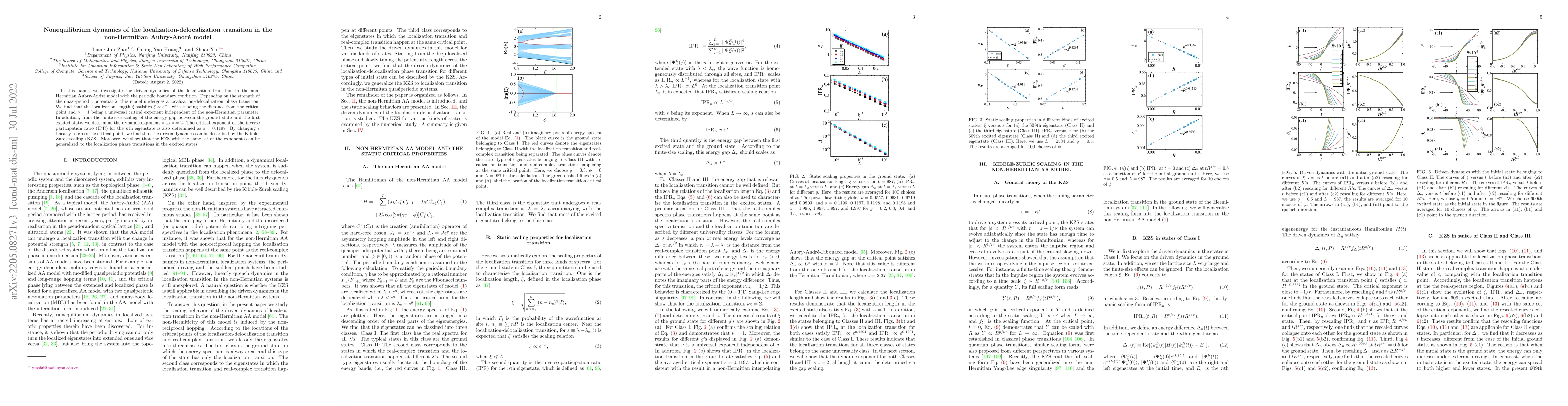 This paper explores the nonequilibrium dynamics of the localization-delocalization transition in the non-Hermitian Aubry-André model, finding that the localization length scales as $\varepsilon^{-\nu}$ with $\nu=1$ and the dynamic exponent $z=2$. The study also generalizes Kibble-Zurek scaling to describe the driven dynamics across the critical point.