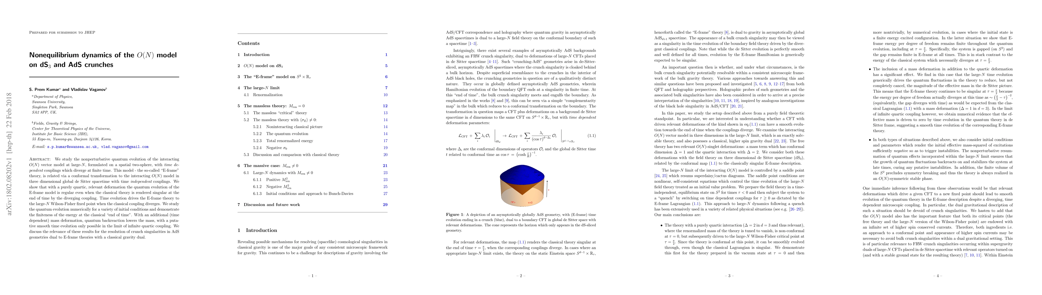 We study the nonperturbative quantum evolution of the interacting O(N) vector model at large-N, formulated on a spatial two-sphere, with time dependent couplings which diverge at finite time. This model - the so-called "E-frame" theory, is related via a conformal transformation to the interacting O(N) model in three dimensional global de Sitter spacetime with time independent couplings. We show that with a purely quartic, relevant deformation the quantum evolution of the E-frame model is regular even when the classical theory is rendered singular at the end of time by the diverging coupling. Time evolution drives the E-frame theory to the large-N Wilson-Fisher fixed point when the classical coupling diverges. We study the quantum evolution numerically for a variety of initial conditions and demonstrate the finiteness of the energy at the classical "end of time". With an additional (time dependent) mass deformation, quantum backreaction lowers the mass, with a putative smooth time evolution only possible in the limit of infinite quartic coupling. We discuss the relevance of these results for the resolution of crunch singularities in AdS geometries dual to E-frame theories with a classical gravity dual.
