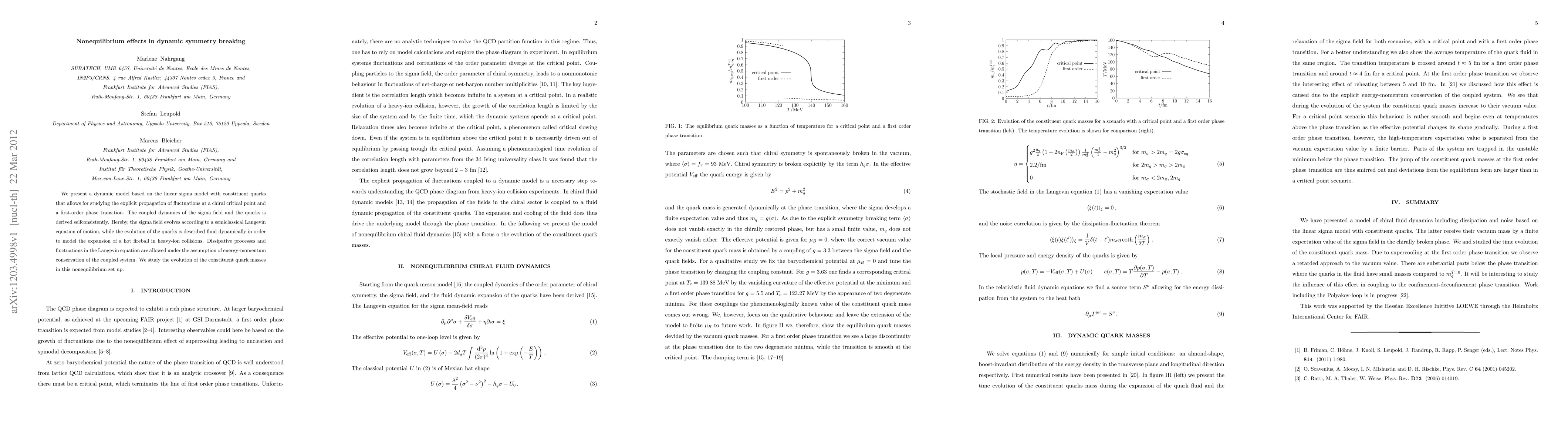 We present a dynamic model based on the linear sigma model with constituent quarks that allows for studying the explicit propagation of fluctuations at a chiral critical point and a first-order phase transition. The coupled dynamics of the sigma field and the quarks is derived selfconsistently. Hereby, the sigma field evolves according to a semiclassical Langevin equation of motion, while the evolution of the quarks is described fluid dynamically in order to model the expansion of a hot fireball in heavy-ion collisions. Dissipative processes and fluctuations in the Langevin equation are allowed under the assumption of energy-momentum conservation of the coupled system. We study the evolution of the constituent quark masses in this nonequilibrium set up.