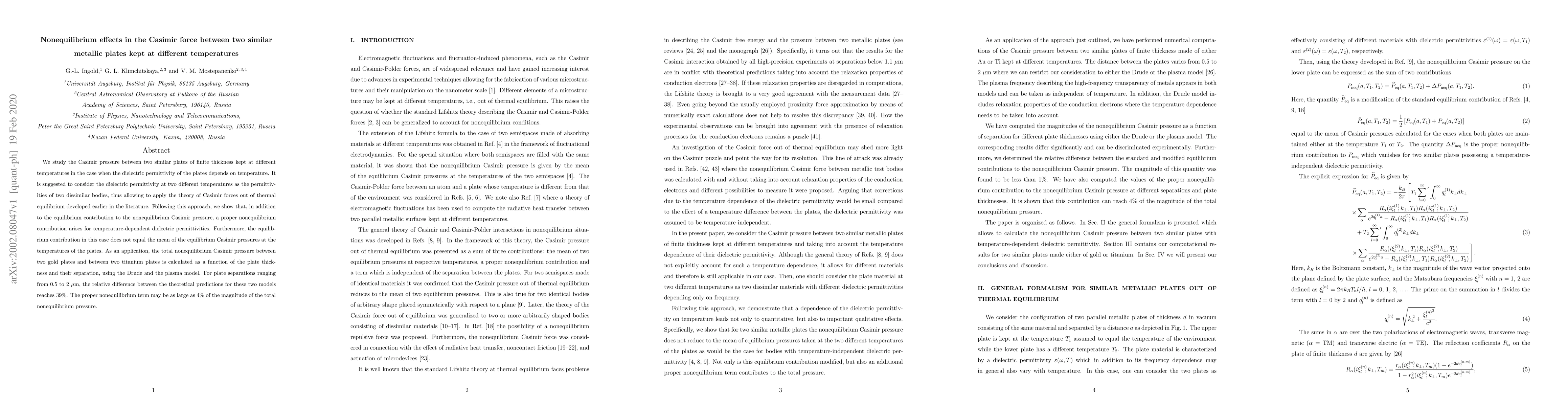 This paper investigates the nonequilibrium Casimir force between two metallic plates at different temperatures, considering temperature-dependent dielectric permittivity. It finds both equilibrium and nonequilibrium contributions to the pressure, with the latter being significant and non-additive. Calculations for gold and titanium plates show notable differences between theoretical models.