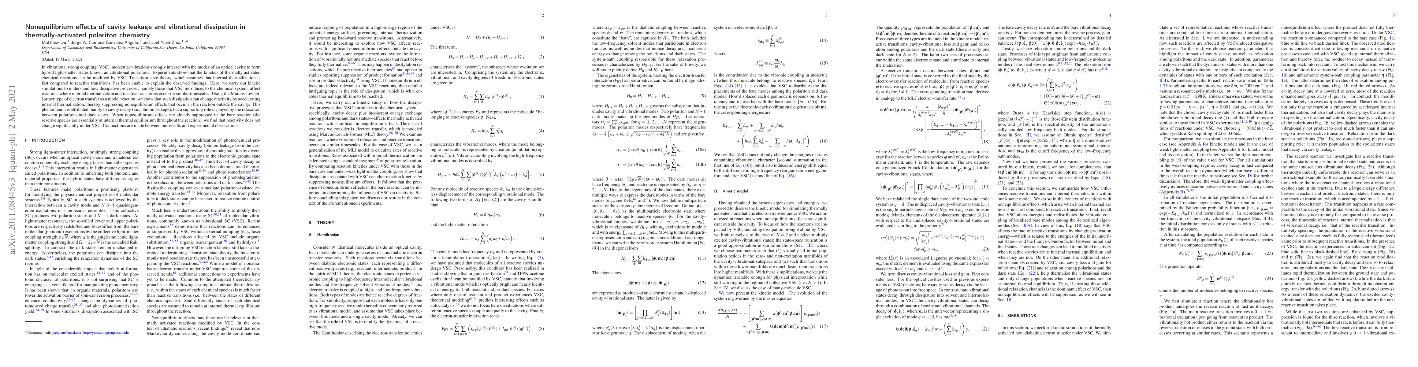 In vibrational strong coupling (VSC), molecular vibrations strongly interact with the modes of an optical cavity to form hybrid light-matter states known as vibrational polaritons. Experiments show that the kinetics of thermally activated chemical reactions can be modified by VSC. Transition-state theory, which assumes that internal thermalization is fast compared to reactive transitions, has been unable to explain the observed findings. Here, we carry out kinetic simulations to understand how dissipative processes, namely those that VSC introduces to the chemical system, affect reactions where internal thermalization and reactive transitions occur on similar timescales. Using the Marcus-Levich-Jortner type of electron transfer as a model reaction, we show that such dissipation can change reactivity by accelerating internal thermalization, thereby suppressing nonequilibrium effects that occur in the reaction outside the cavity. This phenomenon is attributed mainly to cavity decay (i.e., photon leakage), but a supporting role is played by the relaxation between polaritons and dark states. When nonequilibrium effects are already suppressed in the bare reaction (the reactive species are essentially at internal thermal equilibrium throughout the reaction), we find that reactivity does not change significantly under VSC. Connections are made between our results and experimental observations.