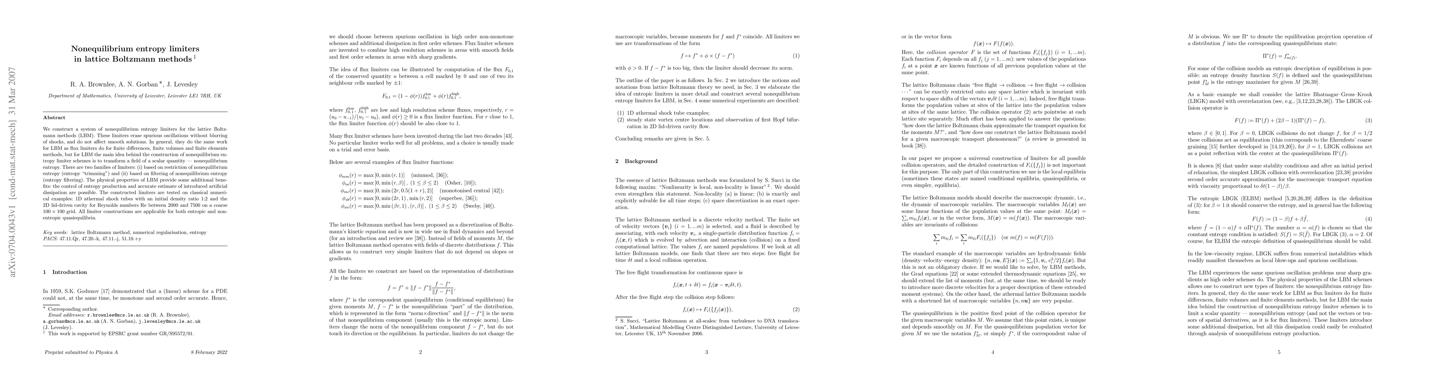 We construct a system of nonequilibrium entropy limiters for the lattice Boltzmann methods (LBM). These limiters erase spurious oscillations without blurring of shocks, and do not affect smooth solutions. In general, they do the same work for LBM as flux limiters do for finite differences, finite volumes and finite elements methods, but for LBM the main idea behind the construction of nonequilibrium entropy limiter schemes is to transform a field of a scalar quantity - nonequilibrium entropy. There are two families of limiters: (i) based on restriction of nonequilibrium entropy (entropy "trimming") and (ii) based on filtering of nonequilibrium entropy (entropy filtering). The physical properties of LBM provide some additional benefits: the control of entropy production and accurate estimate of introduced artificial dissipation are possible. The constructed limiters are tested on classical numerical examples: 1D athermal shock tubes with an initial density ratio 1:2 and the 2D lid-driven cavity for Reynolds numbers Re between 2000 and 7500 on a coarse 100*100 grid. All limiter constructions are applicable for both entropic and non-entropic quasiequilibria.