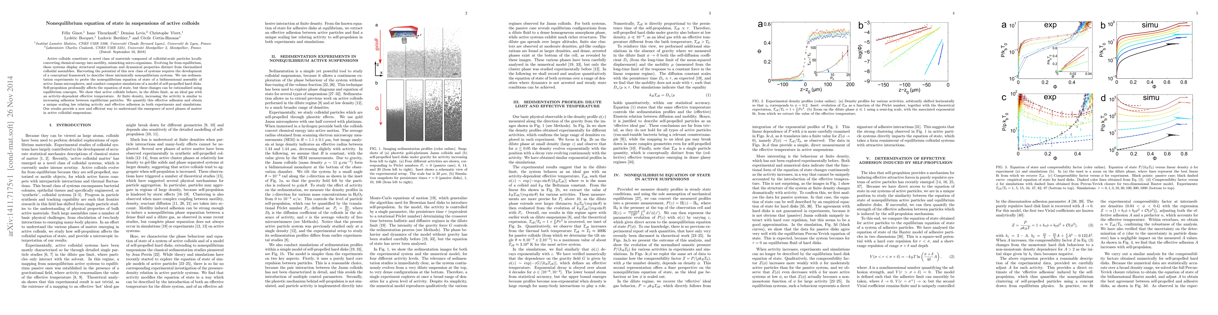 This paper investigates the nonequilibrium equation of state in suspensions of active colloids, demonstrating that self-propelled particles behave like an ideal gas with an activity-dependent effective temperature. The study reveals a unique scaling law relating activity to effective adhesion, providing insights into the novel phases of matter in these systems.