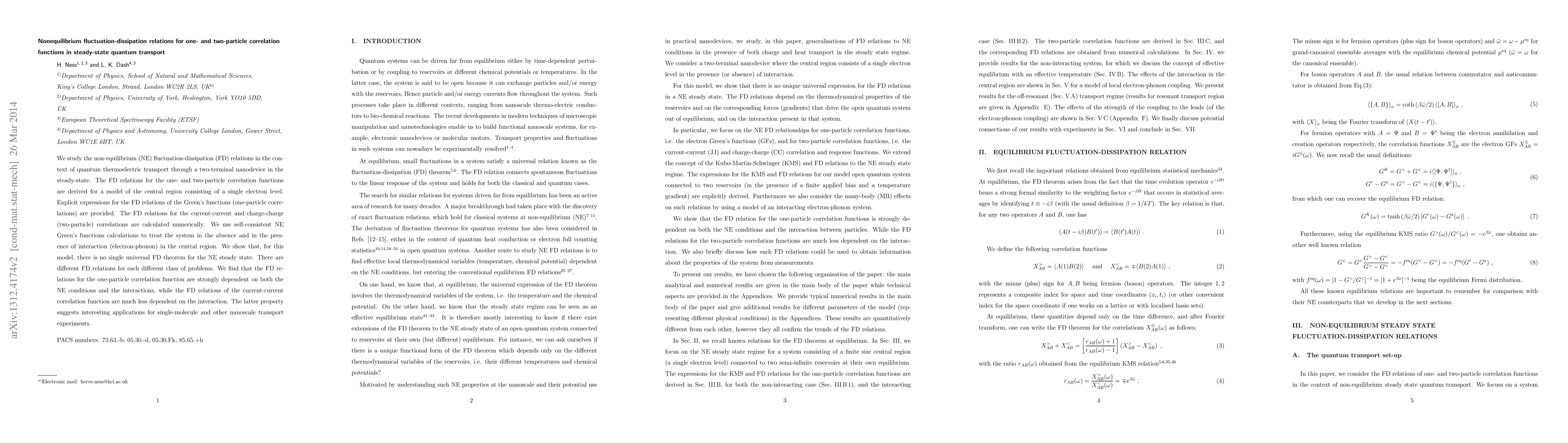 This paper derives nonequilibrium fluctuation-dissipation relations for one- and two-particle correlation functions in steady-state quantum transport through a nanodevice. It finds that different FD relations apply to various correlation classes, with one-particle correlations strongly influenced by nonequilibrium conditions and interactions, while two-particle correlations show less dependency on interactions.