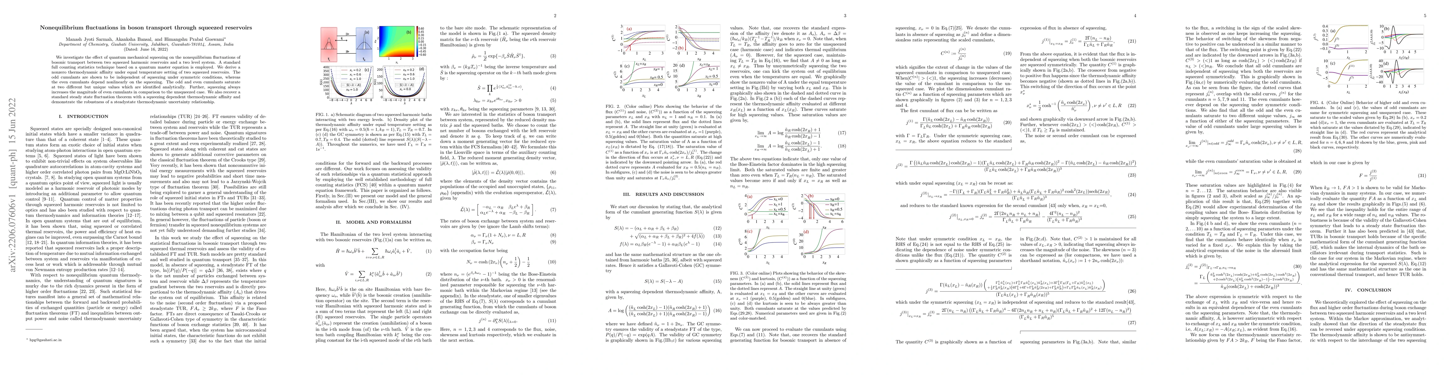 This paper investigates how quantum mechanical squeezing affects nonequilibrium fluctuations in bosonic transport between squeezed reservoirs and a two-level system. The study reveals that squeezing influences even cumulants nonlinearly while odd cumulants remain unaffected under symmetric conditions, and both saturate at unique values.