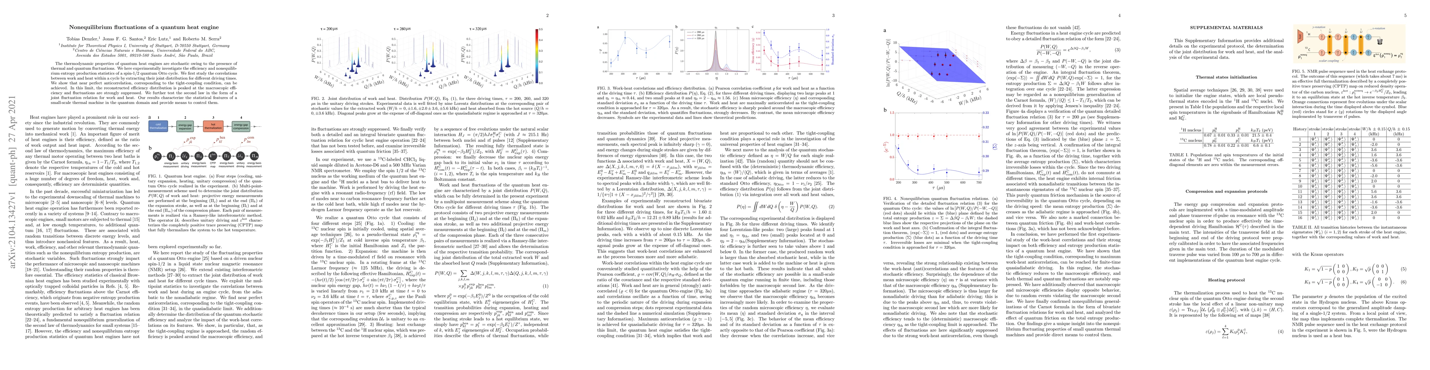 This paper experimentally investigates the efficiency and nonequilibrium entropy production in a quantum Otto cycle, demonstrating near perfect anticorrelation between work and heat, which suppresses fluctuations and peaks efficiency. The study also tests a joint fluctuation relation, characterizing the statistical features of quantum heat engines.