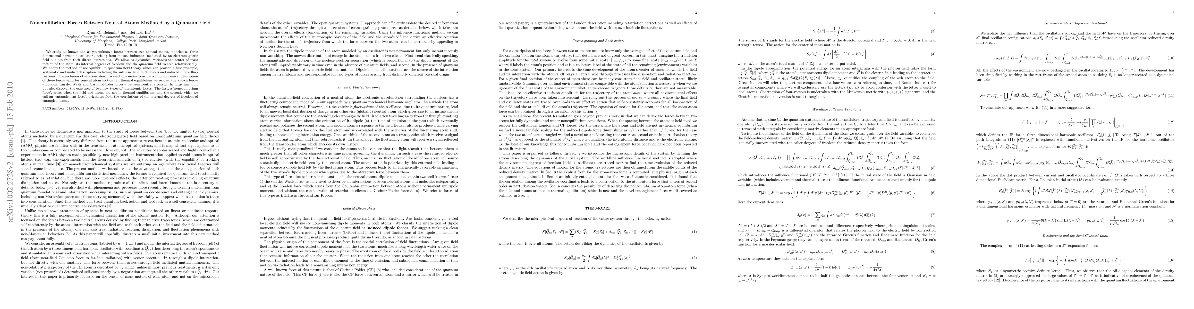 This paper investigates novel forces between neutral atoms mediated by an electromagnetic field using nonequilibrium quantum field theory, revealing two new types: a nonequilibrium force arising from non-thermal equilibrium conditions and an entanglement force from internal degree correlations in entangled atoms.