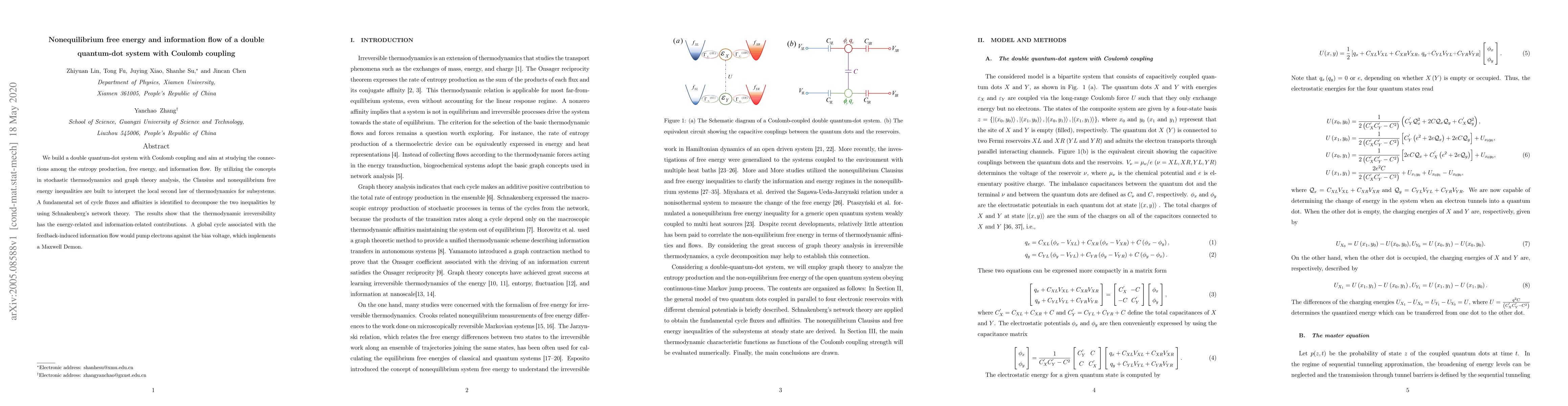 We build a double quantum-dot system with Coulomb coupling and aim at studying the connections among the entropy production, free energy, and information flow. By utilizing the concepts in stochastic thermodynamics and graph theory analysis, the Clausius and nonequilibrium free energy inequalities are built to interpret the local second law of thermodynamics for subsystems. A fundamental set of cycle fluxes and affinities is identified to decompose the two inequalities by using Schnakenberg's network theory. The results show that the thermodynamic irreversibility has the energy-related and information-related contributions. A global cycle associated with the feedback-induced information flow would pump electrons against the bias voltage, which implements a Maxwell Demon.