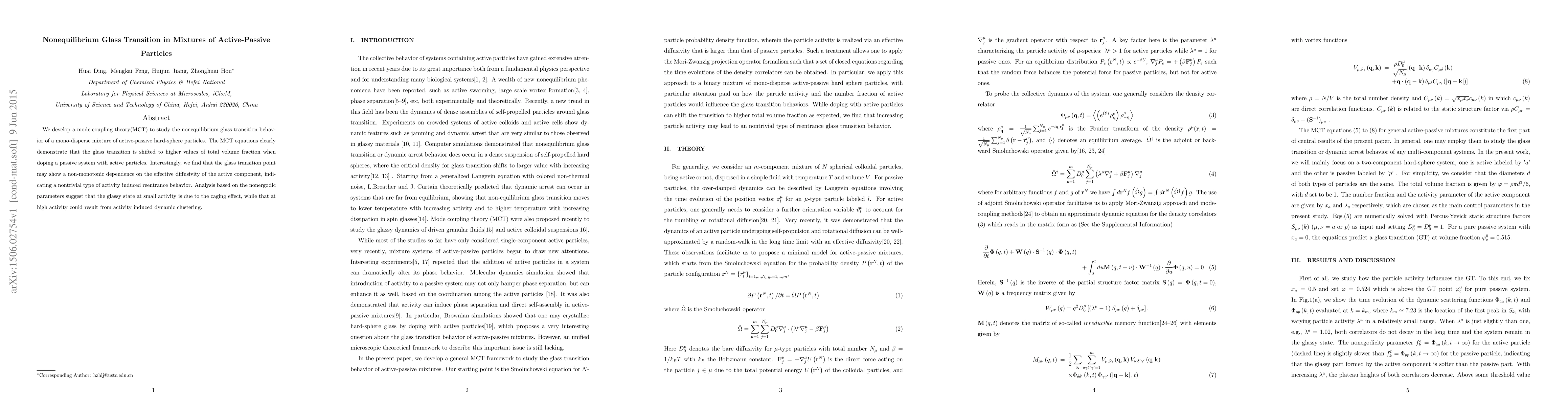 This paper develops a mode coupling theory to explore the nonequilibrium glass transition in mixtures of active and passive particles, showing that the transition shifts to higher volume fractions with active particles. The study reveals a non-monotonic relationship between the glass transition point and the active component's effective diffusivity, indicating complex activity-induced reentrance behavior.