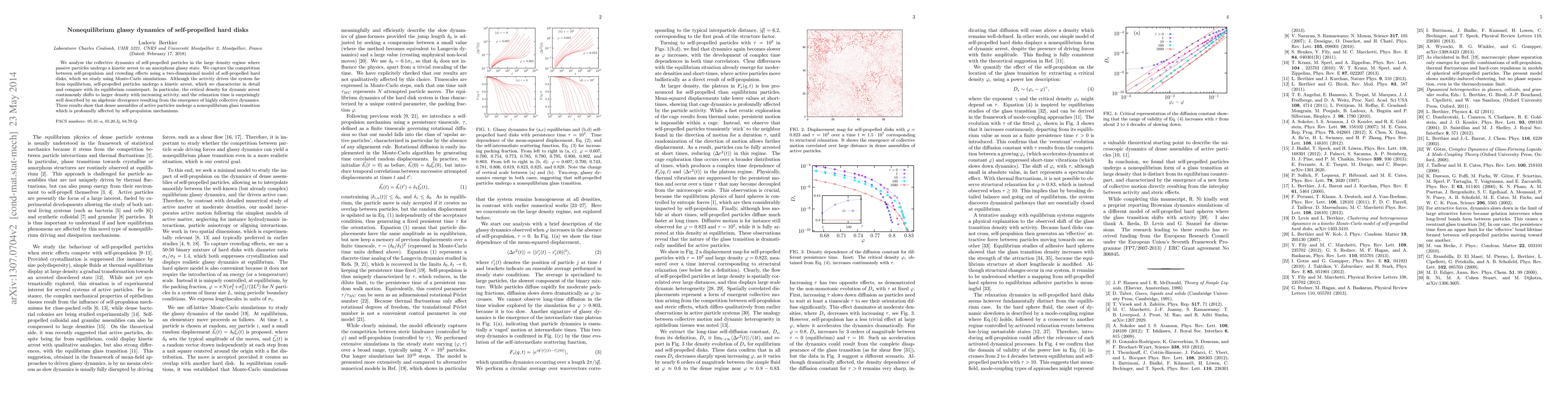 This paper investigates the dynamics of self-propelled hard disks in high-density conditions, revealing a nonequilibrium glass transition driven by self-propulsion. Monte-Carlo simulations show that despite activity, the system undergoes kinetic arrest, with critical density shifting and relaxation time exhibiting algebraic divergence due to collective dynamics.