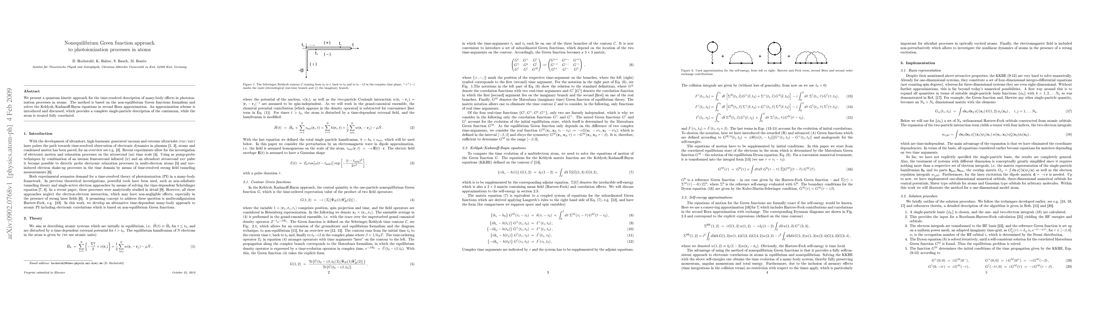 This paper introduces a quantum kinetic method using nonequilibrium Green functions to describe many-body effects in photoionization processes in atoms, solving the Keldysh/Kadanoff-Baym equations in second Born approximation, and providing a complete single-particle continuum description while treating the atom fully correlated.
