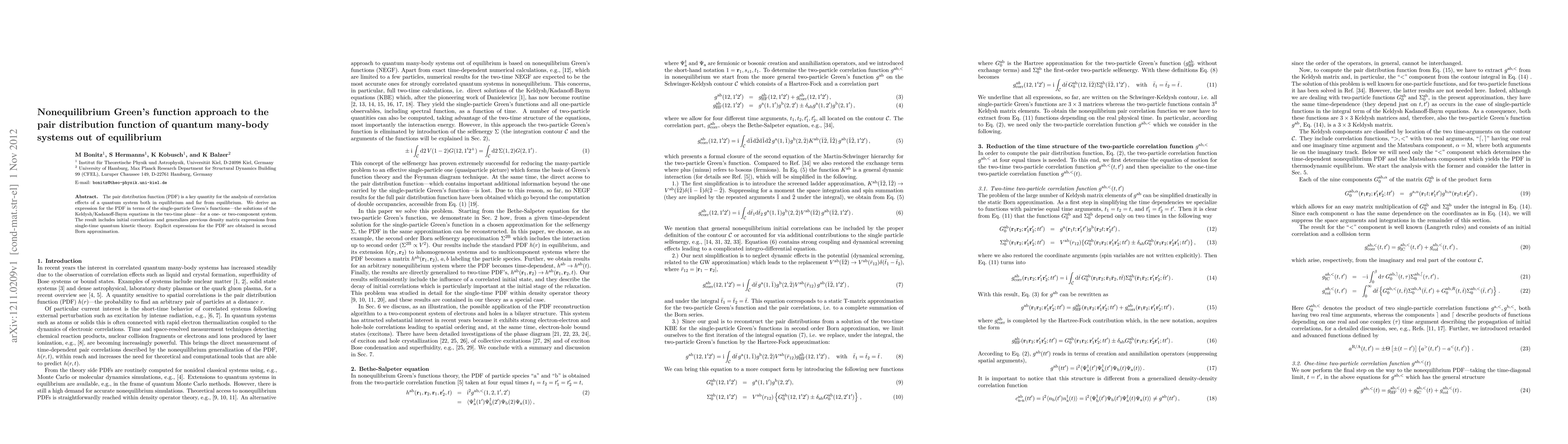 This paper derives an expression for the pair distribution function (PDF) using the nonequilibrium Green's function approach, based on single-particle Green's functions from the Keldysh/Kadanoff-Baym equations. It extends previous density matrix-based expressions and provides explicit PDF calculations in the second Born approximation for quantum many-body systems out of equilibrium.
