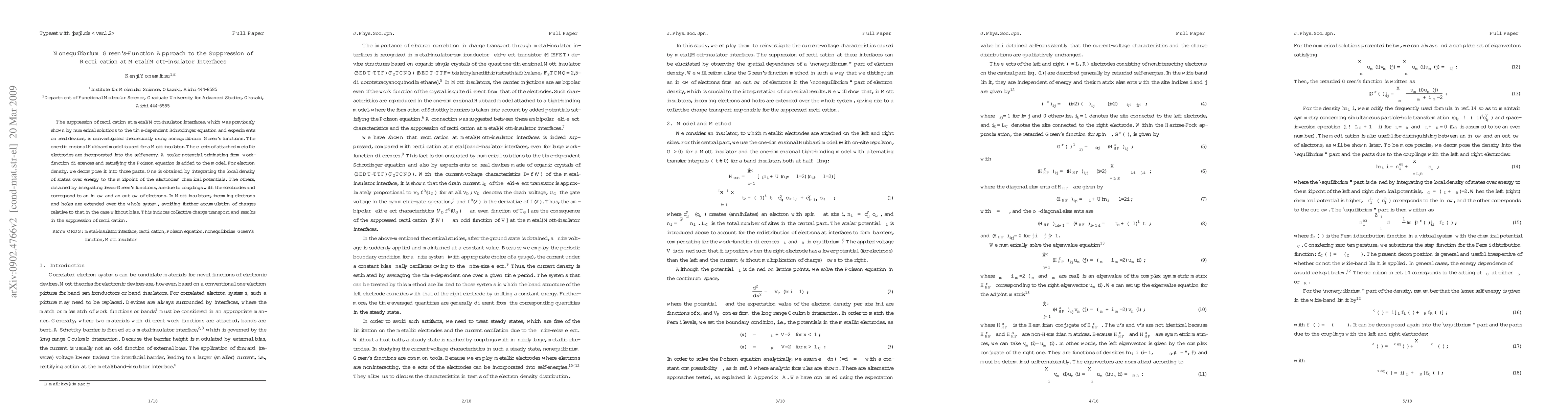 Suppression of rectification at metal--Mott-insulator interfaces, which is previously shown by numerical solutions to the time-dependent Schr\"odinger equation and experiments on real devices, is reinvestigated theoretically by nonequilibrium Green's functions. The one-dimensional Hubbard model is used for a Mott insulator. The effects of attached metallic electrodes are incorporated into the self-energy. A scalar potential originating from work-function differences and satisfying the Poisson equation is added to the model. For the electron density, we decompose it into three parts. One is obtained by integrating the local density of states over energy to the midpoint of the electrodes' chemical potentials. The others, obtained by integrating lesser Green's functions, are due to the couplings with the electrodes and correspond to an inflow and an outflow of electrons. In Mott insulators, incoming electrons and holes are extended over the whole system, avoiding further accumulation of charge relative to the case without bias. This induces collective charge transport and results in the suppression of rectification.