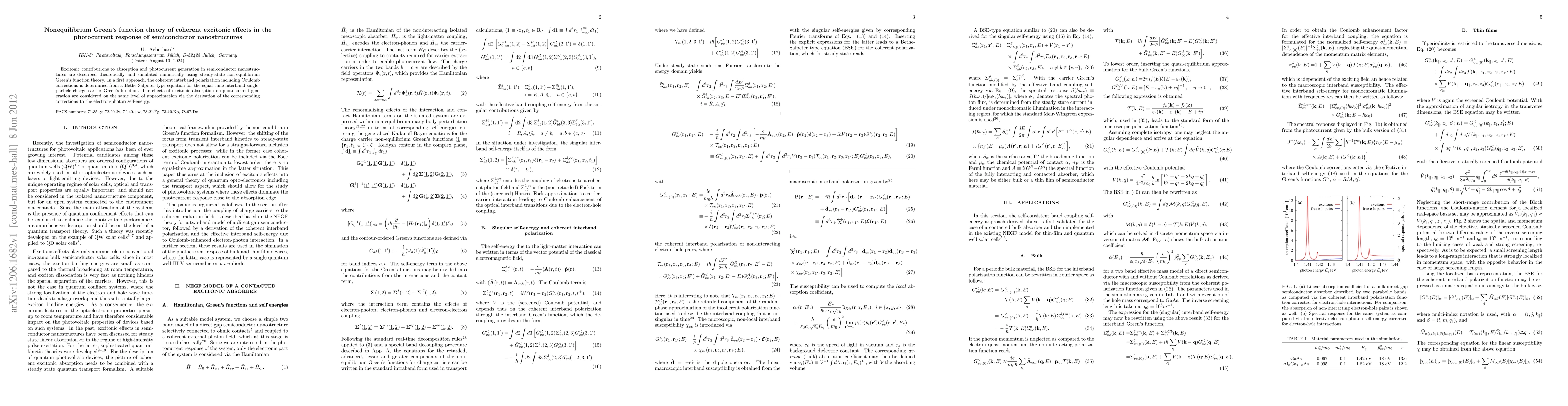 This paper employs nonequilibrium Green's function theory to theoretically and numerically simulate excitonic effects on absorption and photocurrent in semiconductor nanostructures, focusing on coherent interband polarization and Coulomb corrections via Bethe-Salpeter equations. It also derives corrections to the electron-photon self-energy to assess excitonic absorption's impact on photocurrent generation.