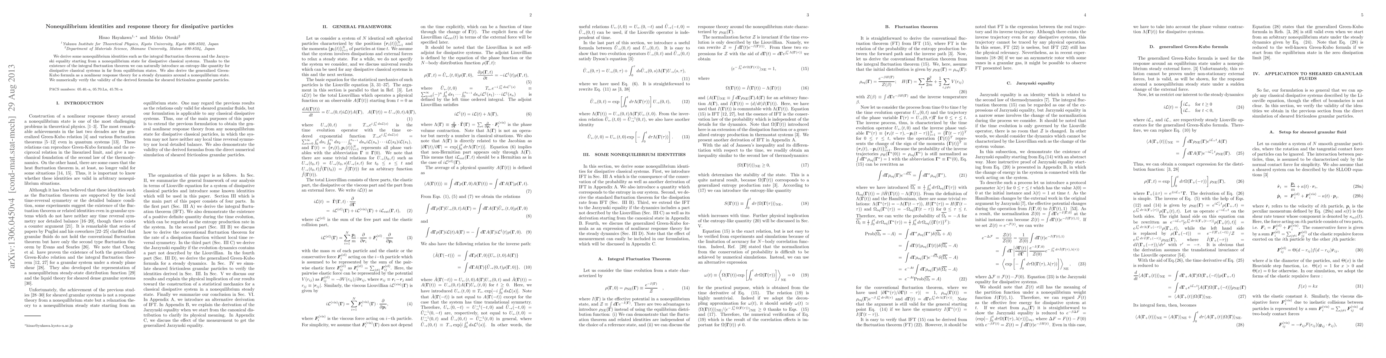 This paper derives nonequilibrium identities, including the integral fluctuation theorem and the Jarzynski equality, for dissipative classical systems starting from a nonequilibrium state. It introduces an entropy-like quantity for such systems and presents a generalized Green-Kubo formula for nonlinear response theory, which is numerically verified using sheared frictionless granular particles.