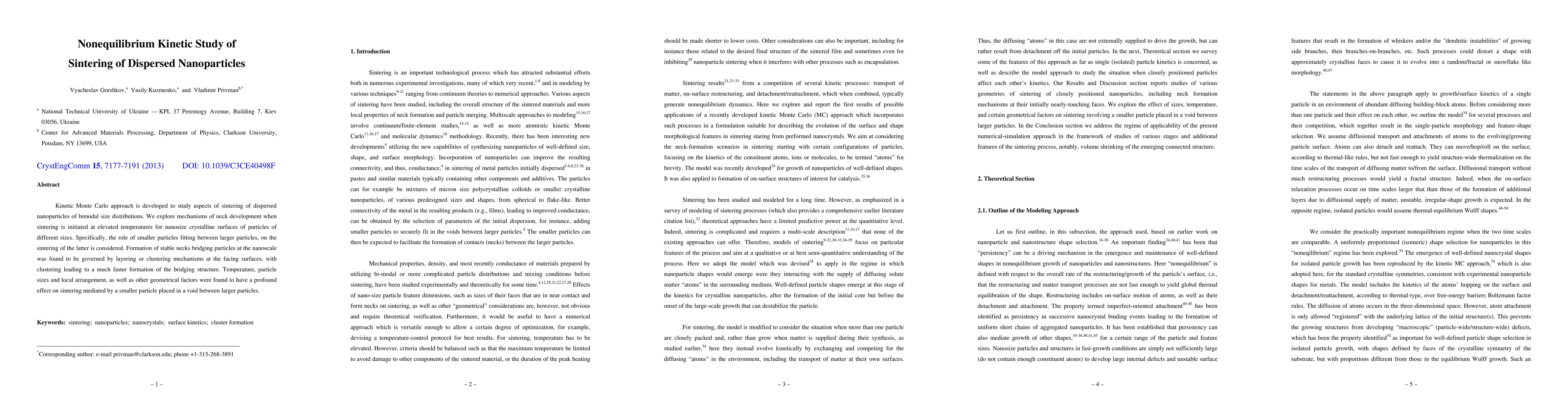 Kinetic Monte Carlo approach is developed to study aspects of sintering of dispersed nanoparticles of bimodal size distributions. We explore mechanisms of neck development when sintering is initiated at elevated temperatures for nanosize crystalline surfaces of particles of different sizes. Specifically, the role of smaller particles fitting between larger particles, on the sintering of the latter is considered. Formation of stable necks bridging particles at the nanoscale was found to be governed by layering or clustering mechanisms at the facing surfaces, with clustering leading to a much faster formation of the bridging structure. Temperature, particle sizes and local arrangement, as well as other geometrical factors were found to have a profound effect on sintering mediated by a smaller particle placed in a void between larger particles.
