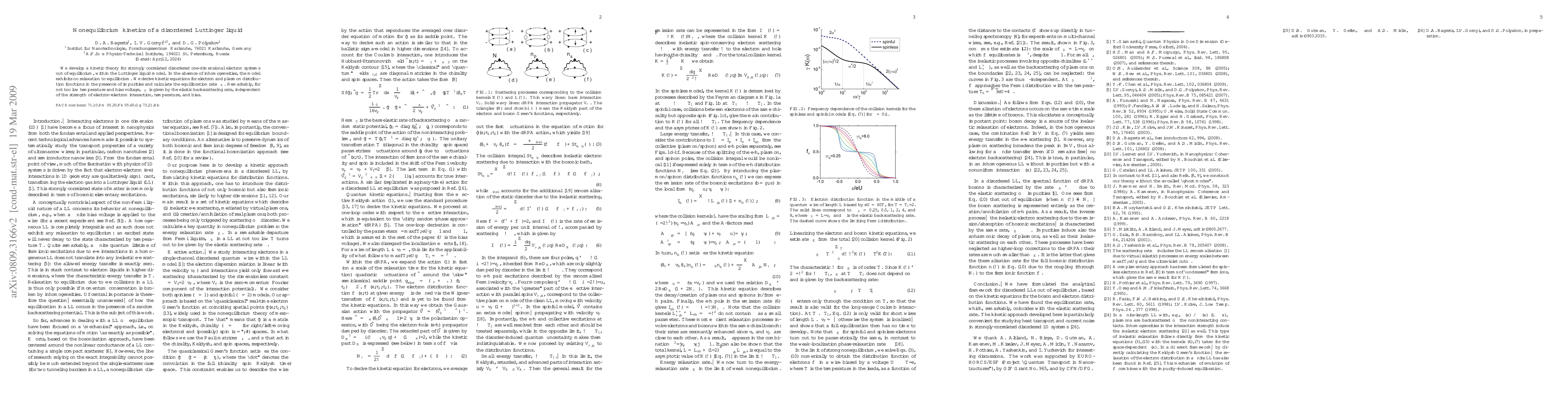 This paper develops a kinetic theory for disordered one-dimensional electron systems, showing that equilibration occurs at a rate dependent on elastic backscattering rather than electron-electron interactions, temperature, or bias voltage under certain conditions.