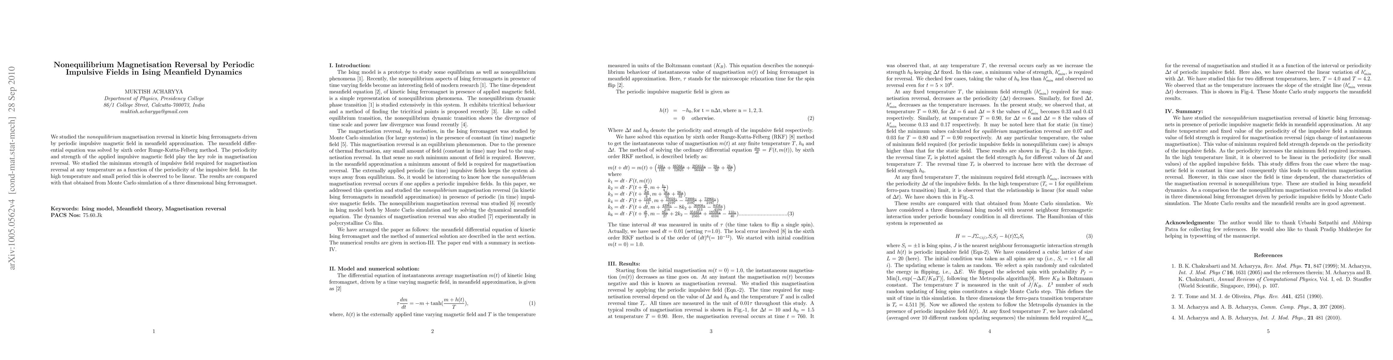 This paper investigates nonequilibrium magnetisation reversal in kinetic Ising ferromagnets under periodic impulsive magnetic fields using meanfield dynamics and the sixth-order Runge-Kutta-Felberg method. The study finds that the periodicity and strength of the impulsive field determine the reversal, with linear relationships observed at high temperatures and small periods, and results compared with Monte Carlo simulations of a three-dimensional Ising ferromagnet.