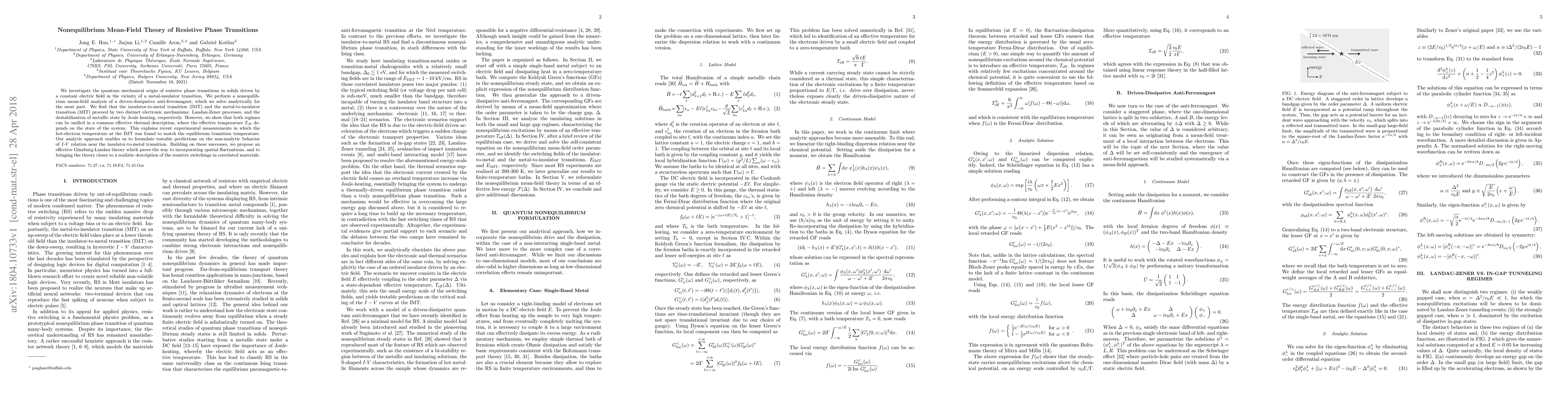 We investigate the quantum mechanical origin of resistive phase transitions in solids driven by a constant electric field in the vicinity of a metal-insulator transition. We perform a nonequilibrium mean-field analysis of a driven-dissipative anti-ferromagnet, which we solve analytically for the most part. We find that the insulator-to-metal transition (IMT) and the metal-to-insulator transition (MIT) proceed by two distinct electronic mechanisms: Landau-Zener processes, and the destabilization of metallic state by Joule heating, respectively. However, we show that both regimes can be unified in a common effective thermal description, where the effective temperature $T_{\rm eff}$ depends on the state of the system. This explains recent experimental measurements in which the hot-electron temperature at the IMT was found to match the equilibrium transition temperature. Our analytic approach enables us to formulate testable predictions on the non-analytic behavior of $I$-$V$ relation near the insulator-to-metal transition. Building on these successes, we propose an effective Ginzburg-Landau theory which paves the way to incorporating spatial fluctuations, and to bringing the theory closer to a realistic description of the resistive switchings in correlated materials.