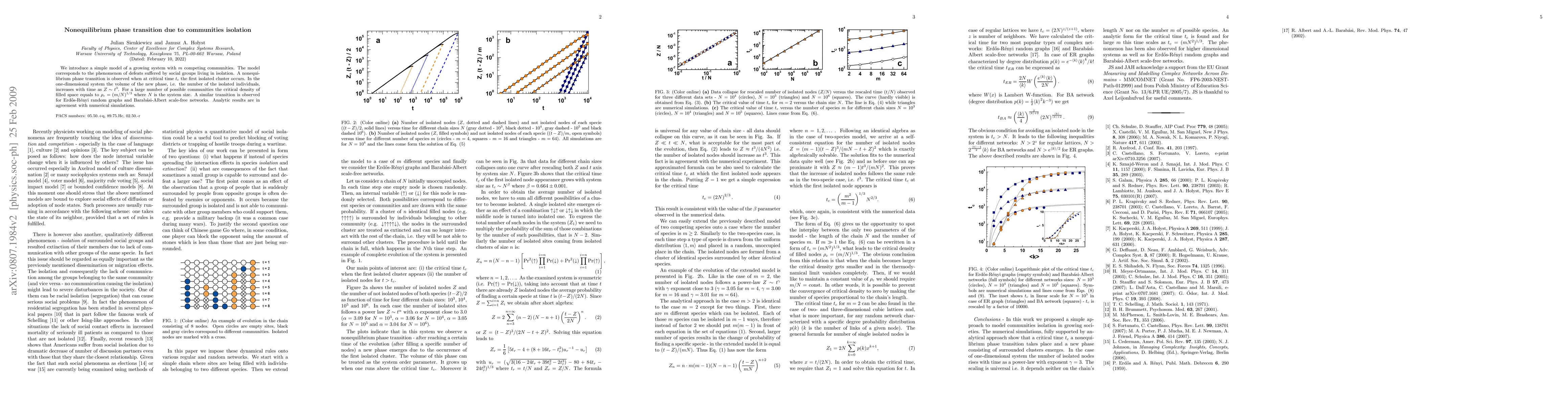 This paper models social group isolation in a growing system with competing communities, revealing a nonequilibrium phase transition at a critical time $t_c$ when the first isolated cluster forms. The volume of isolated individuals grows as $Z \sim t^3$ in one-dimensional systems, with a critical density $\rho_c = (m/N)^{1/3}$ for large community numbers.