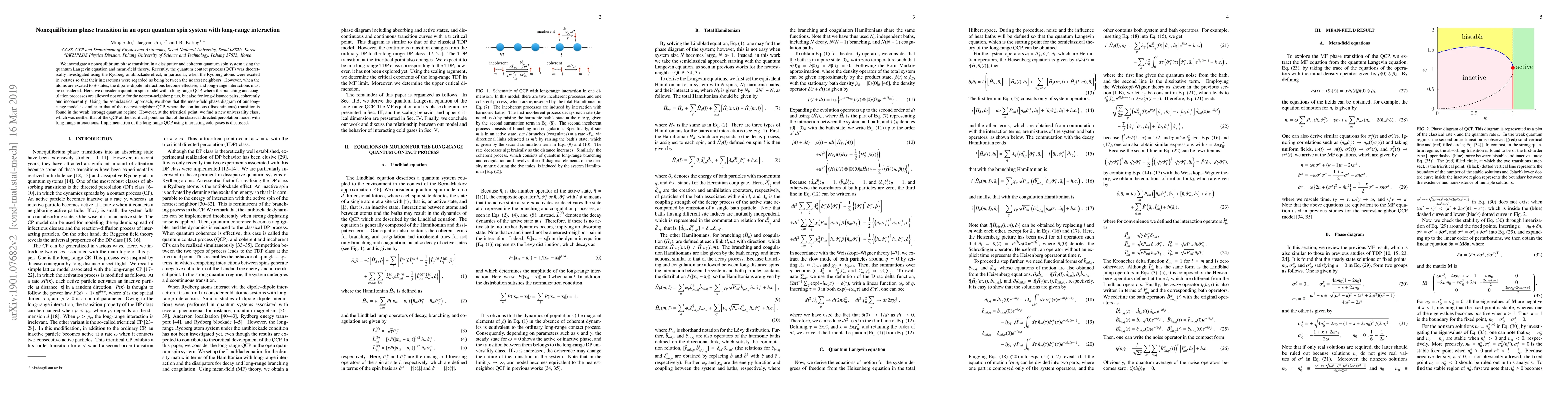We investigate a nonequilibrium phase transition in a dissipative and coherent quantum spin system using the quantum Langevin equation and mean-field theory. Recently, the quantum contact process (QCP) was theoretically investigated using the Rydberg antiblockade effect, in particular, when the Rydberg atoms were excited in s-states so that their interactions were regarded as being between the nearest neighbors. However, when the atoms are excited to d-states, the dipole-dipole interactions become effective, and long-range interactions must be considered. Here, we consider a quantum spin model with a long-range QCP, where the branching and coagulation processes are allowed not only for the nearest-neighbor pairs, but also for long-distance pairs, coherently and incoherently. Using the semiclassical approach, we show that the mean-field phase diagram of our long-range model is similar to that of the nearest-neighbor QCP, where the continuous (discontinuous) transition is found in the weak (strong) quantum regime. However, at the tricritical point, we find a new universality class, which was neither that of the QCP at the tricritical point nor that of the classical directed percolation model with long-range interactions. Implementation of the long-range QCP using interacting cold gases is discussed.