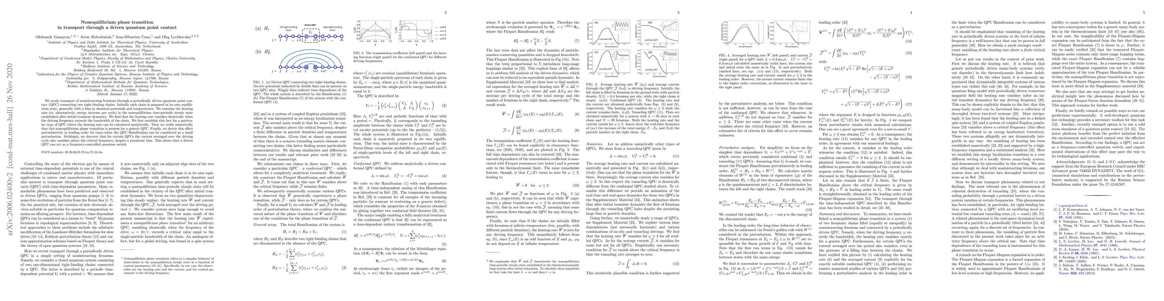 We study transport of noninteracting fermions through a periodically driven quantum point contact (QPC) connecting two tight-binding chains. Initially, each chain is prepared in its own equilibrium state, generally with a bias in chemical potentials and temperatures. We examine the heating rate (or, alternatively, energy increase per cycle) in the nonequilibrium time-periodic steady state established after initial transient dynamics. We find that the heating rate vanishes identically when the driving frequency exceeds the bandwidth of the chain. We first establish this fact for a particular type of QPC where the heating rate can be calculated analytically. Then we verify numerically that this nonequilibrium phase transition is present for a generic QPC. Finally, we derive this effect perturbatively in leading order for cases when the QPC Hamiltonian can be considered as a small perturbation. Strikingly, we discover that for certain QPCs the current averaged over the driving cycle also vanishes above the critical frequency, despite a persistent bias. This shows that a driven QPC can act as a frequency-controlled quantum switch.