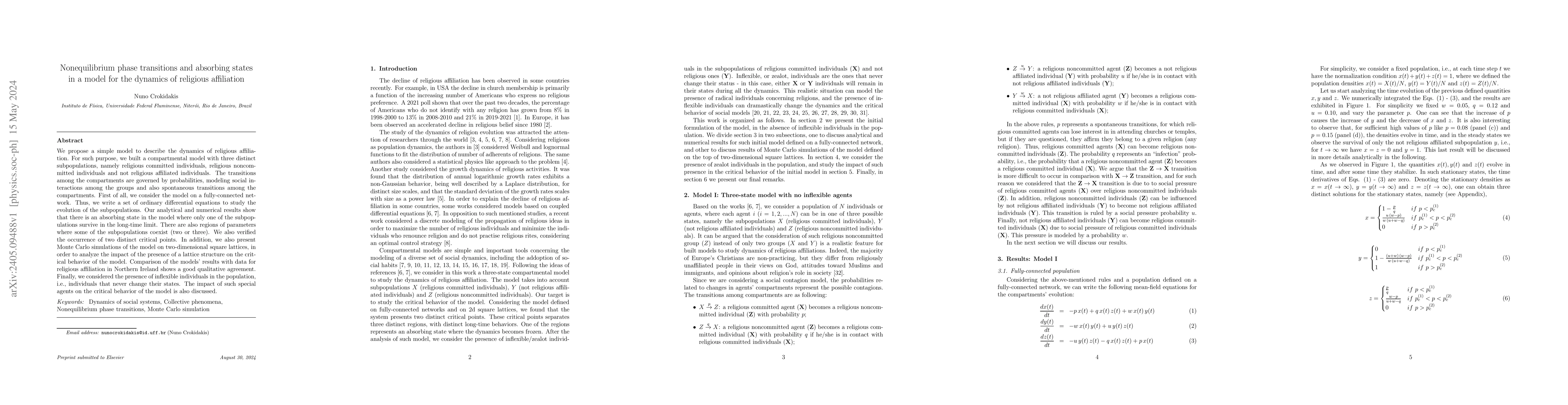 This paper proposes a compartmental model to study the dynamics of religious affiliation, featuring three subpopulations with transitions governed by probabilities. The model reveals an absorbing state where only one subpopulation persists, with coexisting regions and critical points, supported by both analytical and Monte Carlo simulations. Comparisons with Northern Ireland data show qualitative agreement, and the study also investigates the impact of inflexible individuals on the model's critical behavior.