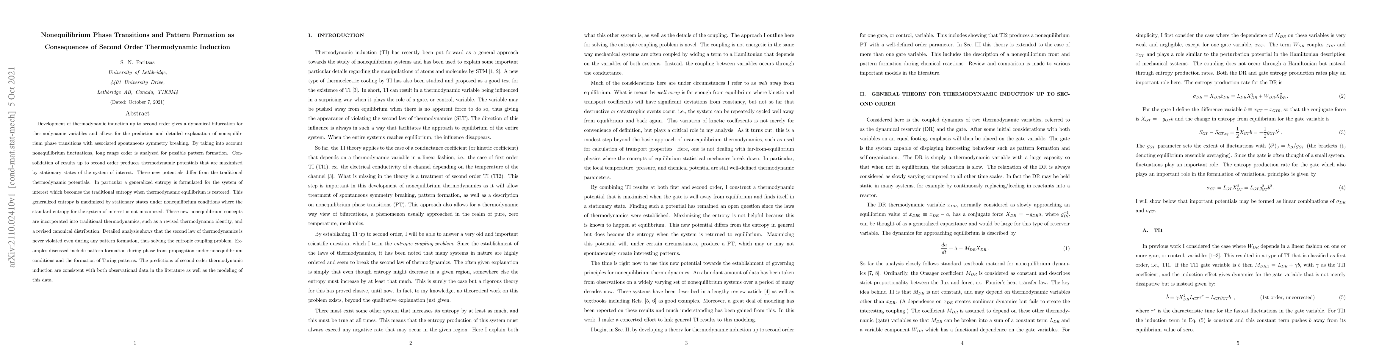Development of thermodynamic induction up to second order gives a dynamical bifurcation for thermodynamic variables and allows for the prediction and detailed explanation of nonequilibrium phase transitions with associated spontaneous symmetry breaking. By taking into account nonequilibrium fluctuations, long range order is analyzed for possible pattern formation. Consolidation of results up to second order produces thermodynamic potentials that are maximized by stationary states of the system of interest. These new potentials differ from the traditional thermodynamic potentials. In particular a generalized entropy is formulated for the system of interest which becomes the traditional entropy when thermodynamic equilibrium is restored. This generalized entropy is maximized by stationary states under nonequilibrium conditions where the standard entropy for the system of interest is not maximized. These new nonequilibrium concepts are incorporated into traditional thermodynamics, such as a revised thermodynamic identity, and a revised canonical distribution. Detailed analysis shows that the second law of thermodynamics is never violated even during any pattern formation, thus solving the entropic coupling problem. Examples discussed include pattern formation during phase front propagation under nonequilibrium conditions and the formation of Turing patterns. The predictions of second order thermodynamic induction are consistent with both observational data in the literature as well as the modeling of this data.