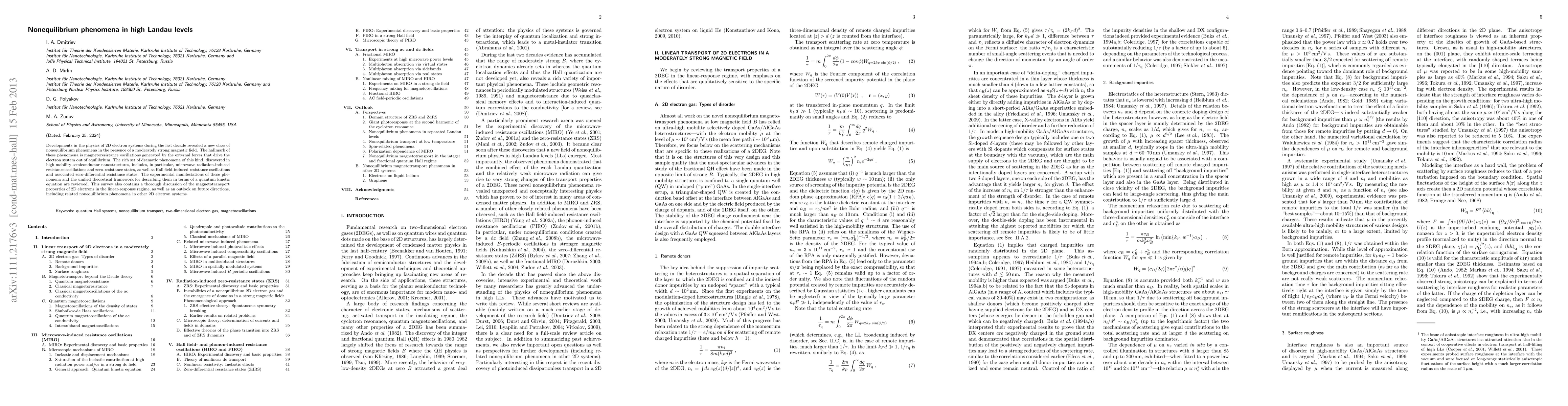 This paper reviews experimental findings and theoretical frameworks for nonequilibrium phenomena in 2D electron systems under strong magnetic fields, including microwave-induced resistance oscillations and zero-resistance states. It also discusses magnetotransport properties and future research directions.