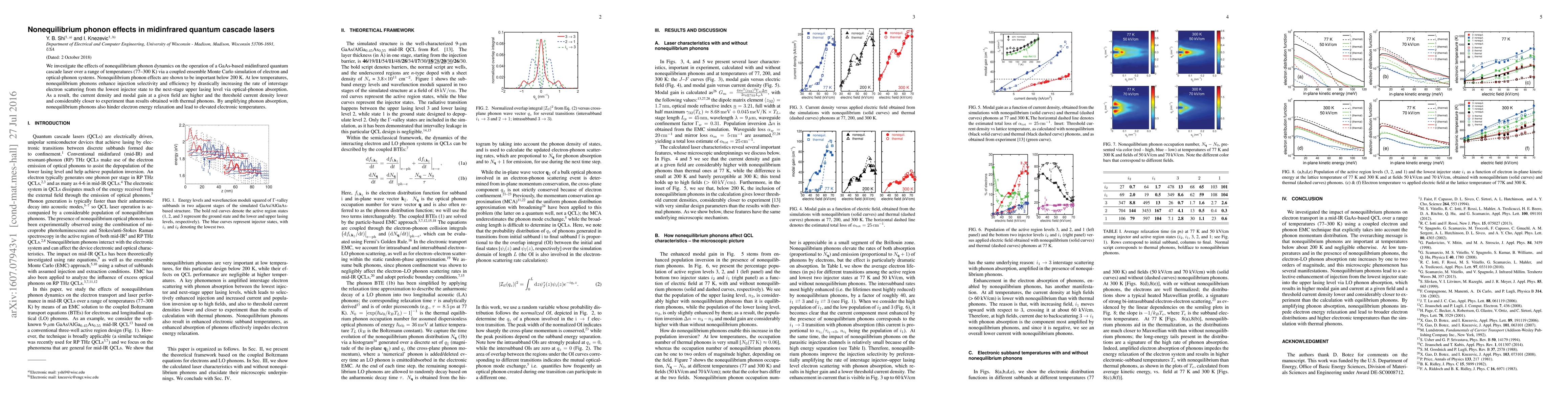 This study uses Monte Carlo simulations to explore nonequilibrium phonon dynamics in GaAs-based midinfrared quantum cascade lasers, revealing significant effects below 200 K. Nonequilibrium phonons enhance injection efficiency and reduce threshold current density, aligning more closely with experimental results than thermal phonon models.