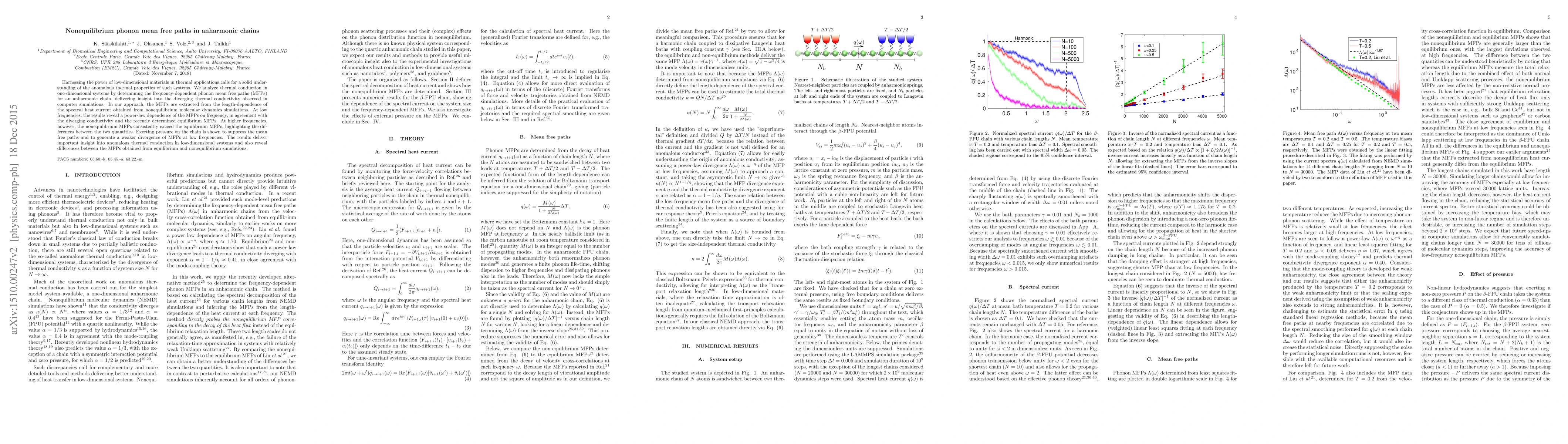 This paper investigates thermal conduction in one-dimensional anharmonic chains, determining frequency-dependent phonon mean free paths (MFPs) from nonequilibrium molecular dynamics. It reveals a power-law frequency dependence at low frequencies and shows that nonequilibrium MFPs exceed equilibrium MFPs at higher frequencies, with pressure suppressing these paths and altering the divergence behavior.